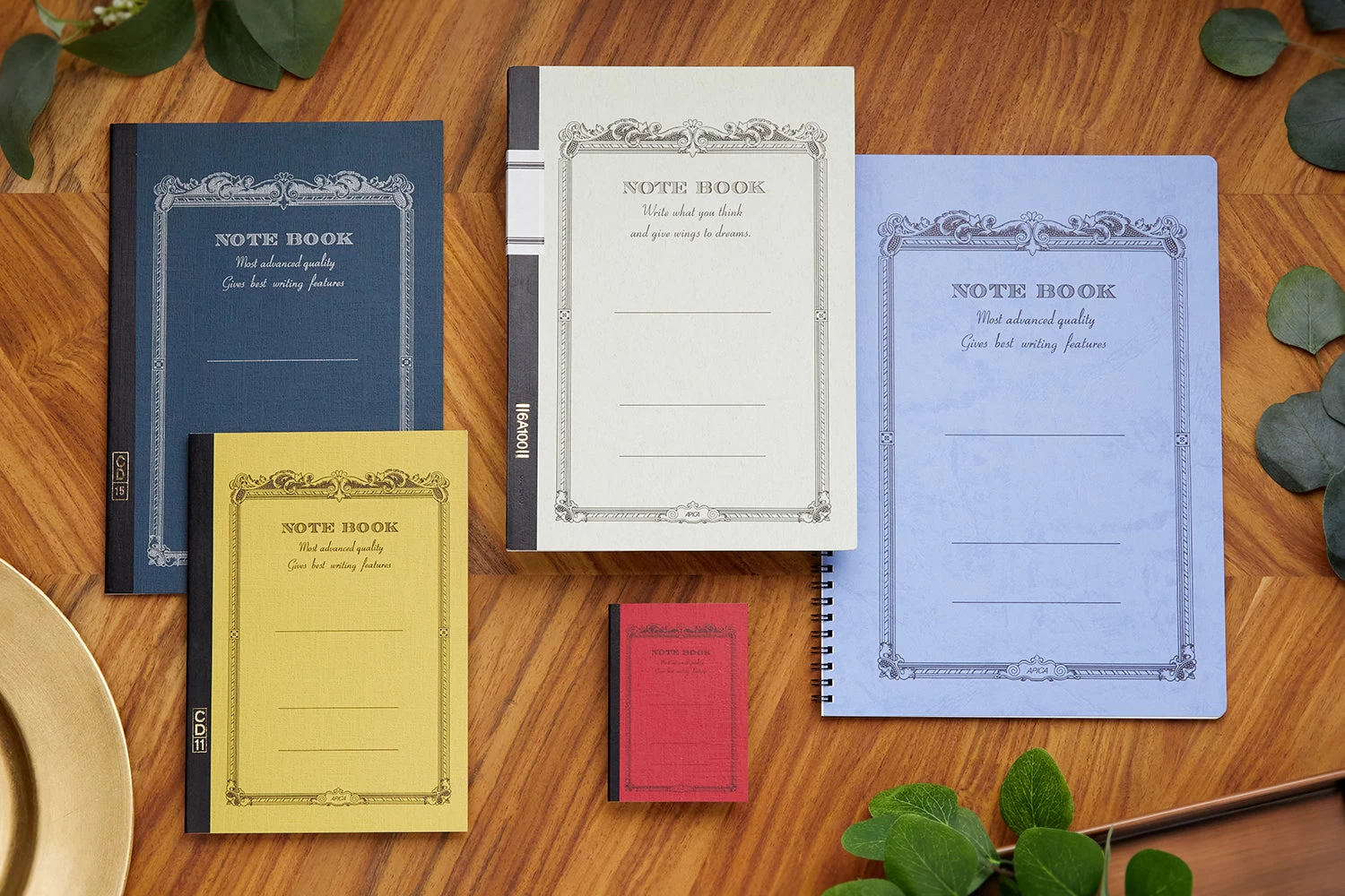 This A5-sized mustard yellow notebook features 28 sheets (56 pages) of white super-smooth ruled paper and reinforced stitched binding. Each sheet has 25 lines, spaced 7mm apart, with a blank margin at the top.