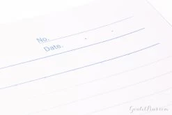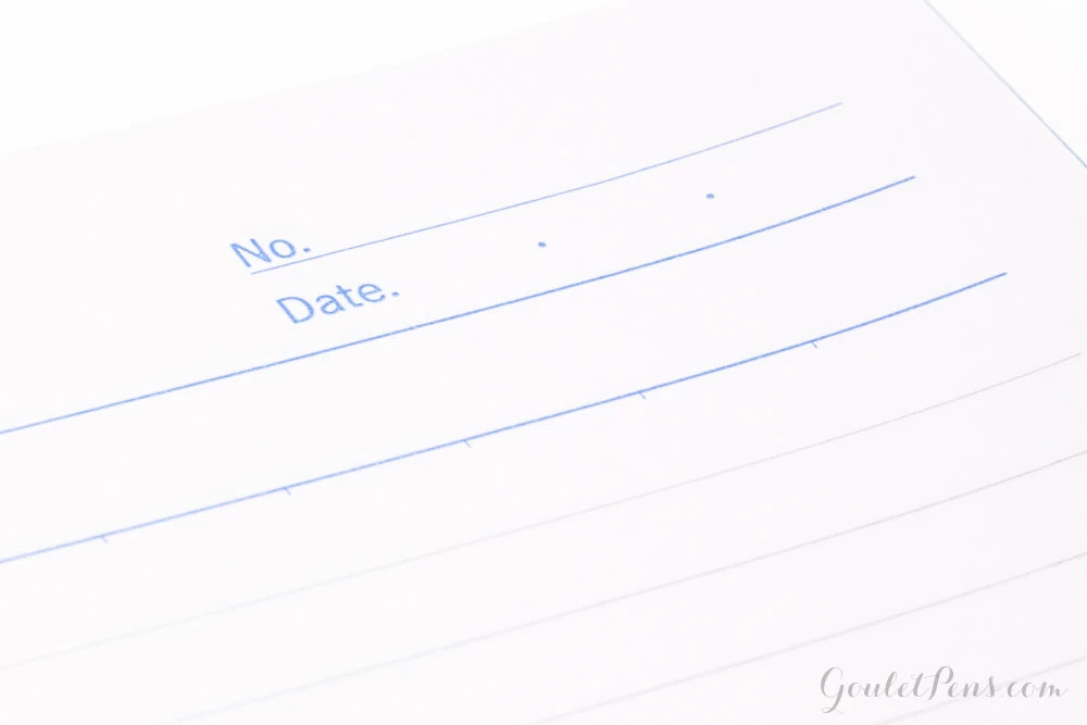 This B5-sized black notebook features 34 sheets (68 pages) of white super-smooth ruled paper and reinforced stitched binding. Each sheet has 32 lines, spaced 6.5mm apart, with a blank margin at the top with a space for the page number and the date.