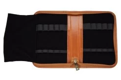 This tan Aston Leather zippered pen case has a black velvet lined interior and holds up to ten pens. Aston leathers are scratch resistant, supple and sturdy. They use only American made, water resistant cowhide leathers. These leathers are top grain, veg-tan (tanned with environmentally friendly oak tree oils) and become supple and more beautiful with age.