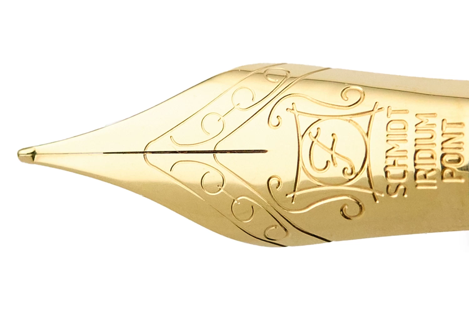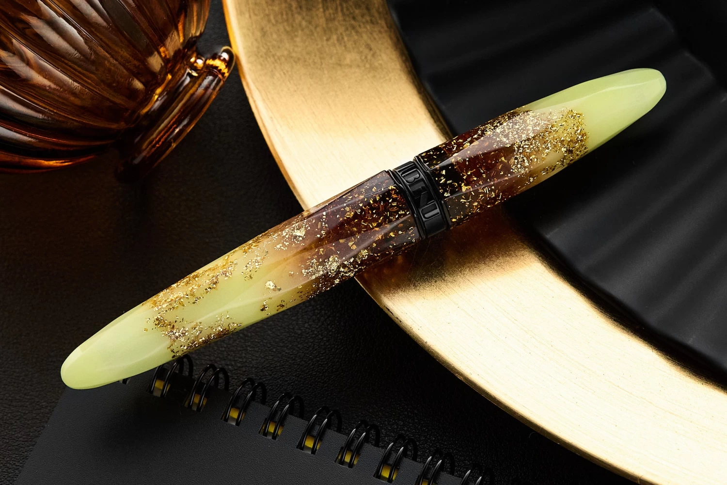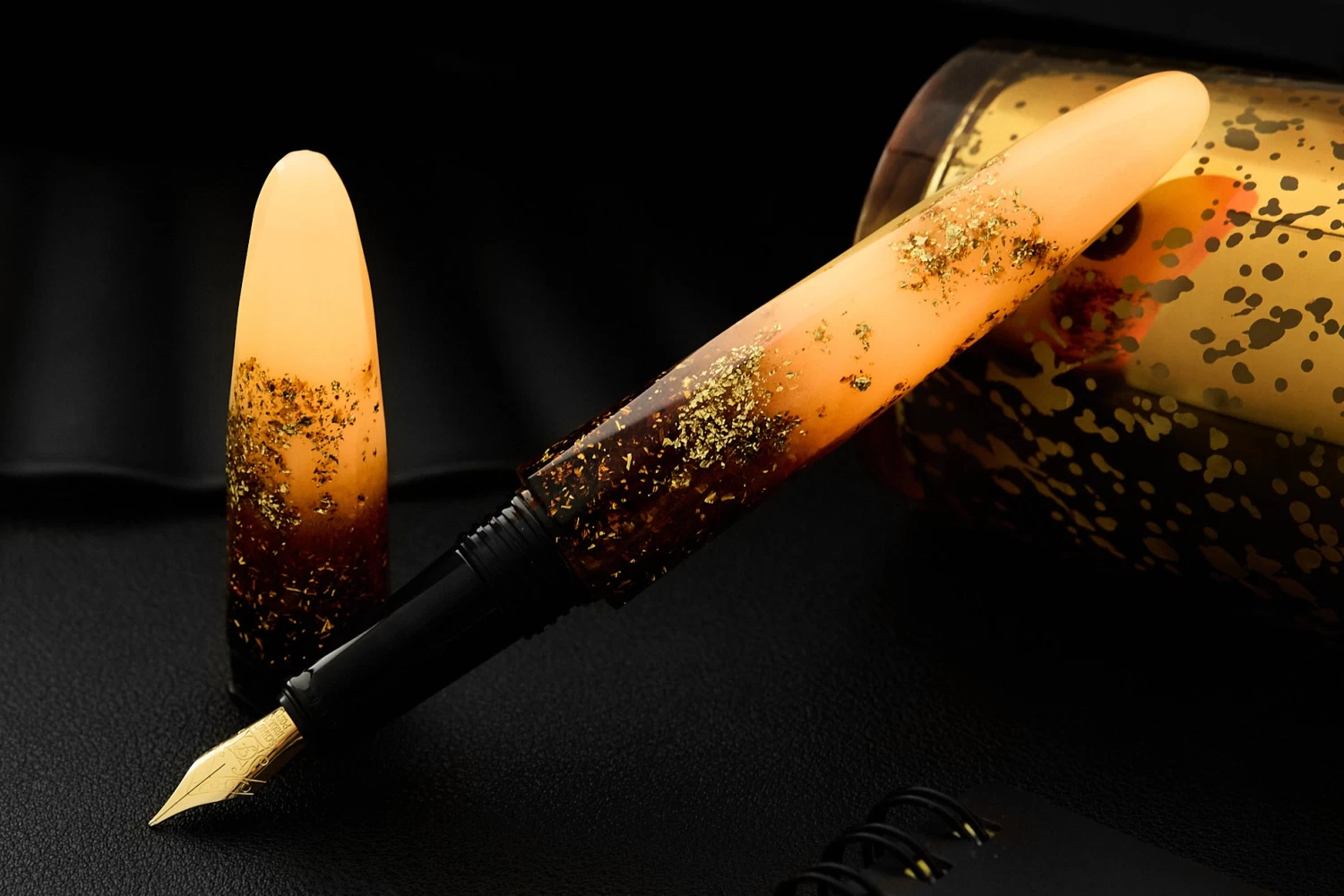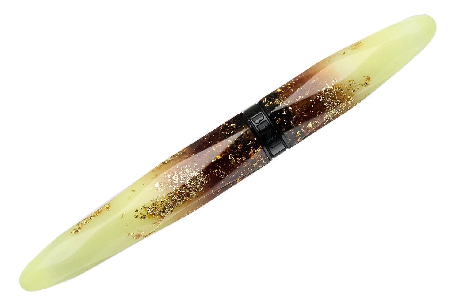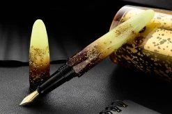 The resin body features an amber and brown base with tons of gold sparkles throughout. It has a gold-plated Schmidt stainless steel nib, a black resin grip, is clipless, and does not post. This fountain pen comes with a standard international converter and one long blue ink cartridge.