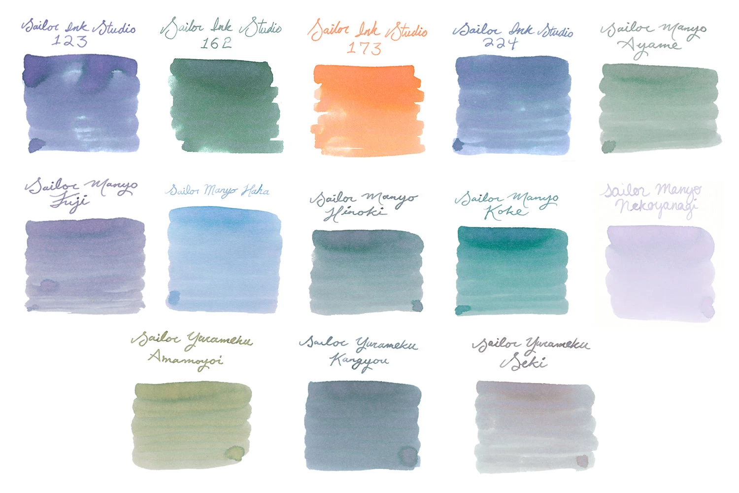 This set of 13 ink samples includes the following Sailor colors: Ink Studio 123, Ink Studio 162, Ink Studio 173, Ink Studio 224, Manyo Ayame, Manyo Fuji, Manyo Haha, Manyo Hikoi, Manyo Koke, Manyo Nekoyanagi, Yurameku Amamoyoi, Yurameku Kangyou, and Yurameku Seki.