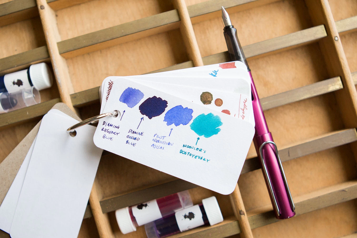 The Col-o-ring Ink Testing Book helps you keep your ever expanding ink sample catalog organized with 100 white sheets of 160g paper bound with a ring clip. Colors pop against the white paper which resists feathering and bleeding. You can use the back of each sheet for more swatches or as a place to make notes about the swatches on the front. The clip ring allows you to easily add, rearrange or remove swatches helping you find the right sample fast.