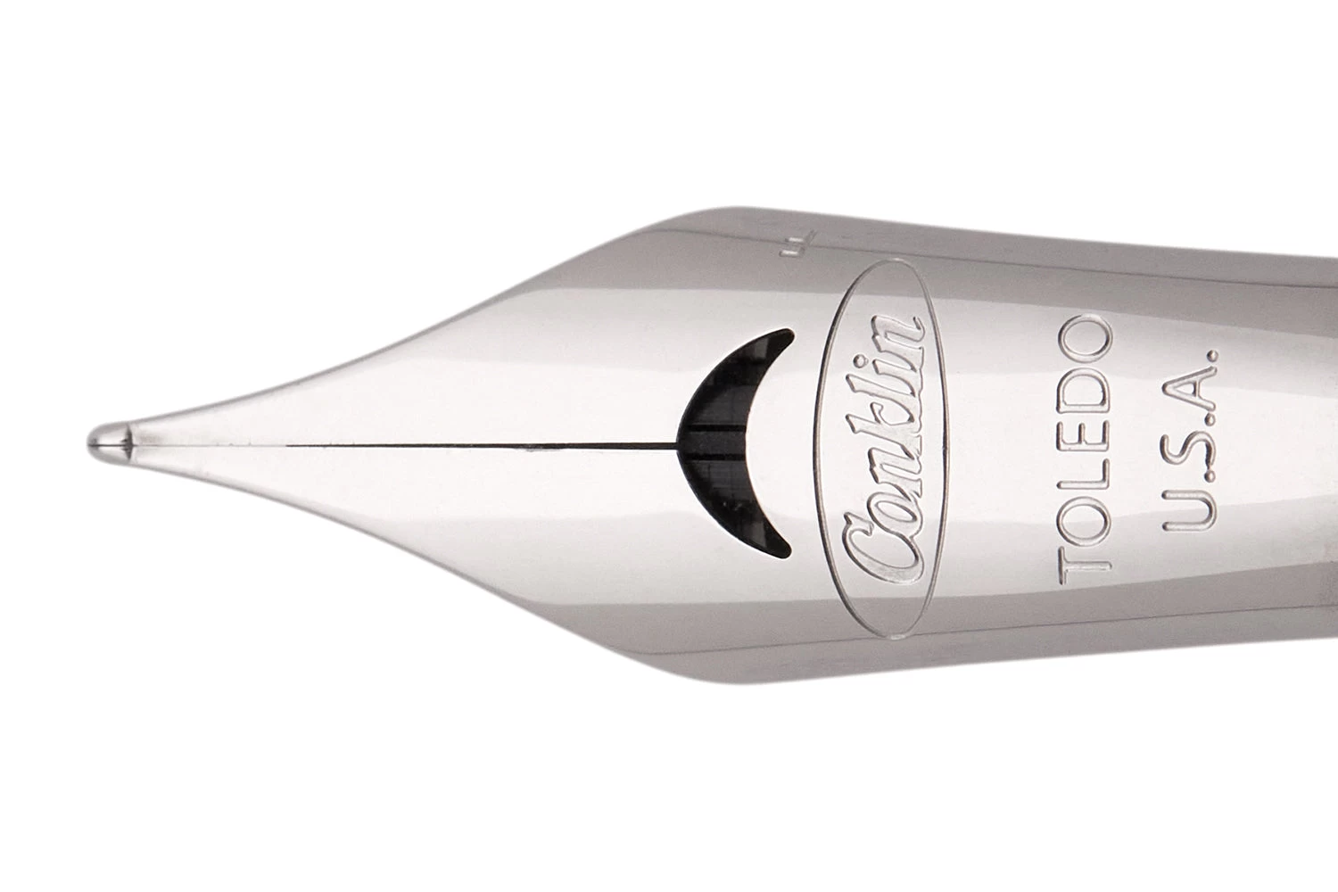 The Conklin 1898 fountain pen is offered with your choice of a reliable, smooth-writing German made JoWo #6 silver steel nib in extra-fine, fine, medium, broad, or 1.1mm stub, as well as the Omniflex flexible steel nib for variation in line width. Each Cushion Point nib displays the brand name and is marked with special crescent-shaped breathing holes. The Conklin quality control team tests each nib individually to ensure top quality writing performance.