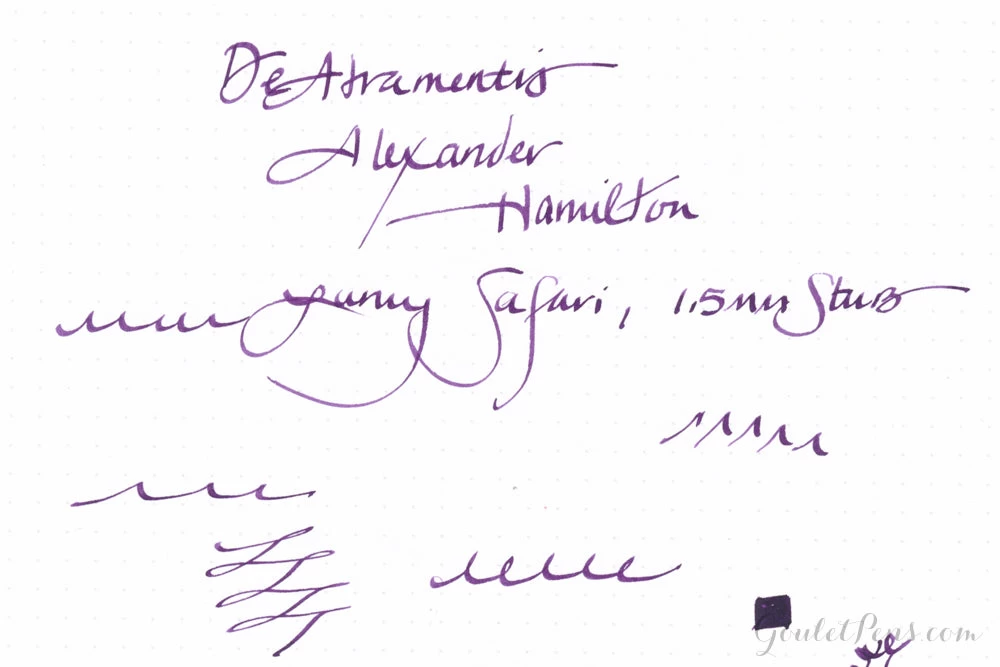 De Atramentis fountain pen inks are exclusively handmade in Germany by Dr. Franz-Josef Jansen, and come in a 45ml glass bottle. This is an aubergine purple color, and has a picture of Alexander Hamilton on the label.