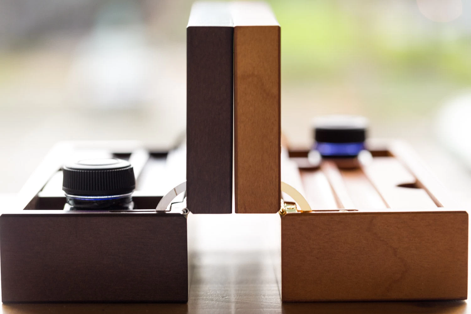 This dark wood pen holder is a must-have desk accessory. It accommodates a small bottle of blue ink (included!) and has a removable writing instrument tray with slots for up to two pens. Underneath this tray you’ll find an accessory compartment for spare converters, cartridges, etc.