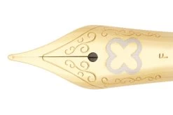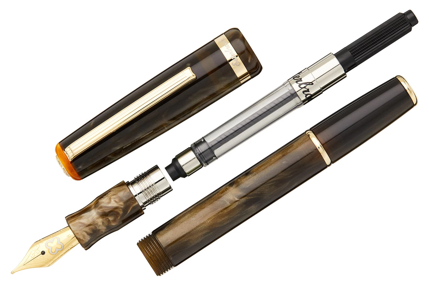 This pearlescent brown resin pocket-sized fountain pen is the Esterbrook JR, short for “J Reborn”. It comes with gold-plated trim and an orange finial. A modern take on a vintage classic. It fills via standard international cartridge/converter (included) and has a JoWo #5 stainless steel nib.