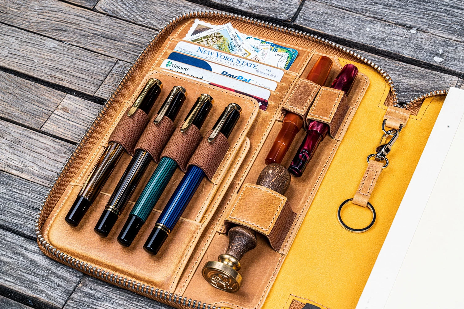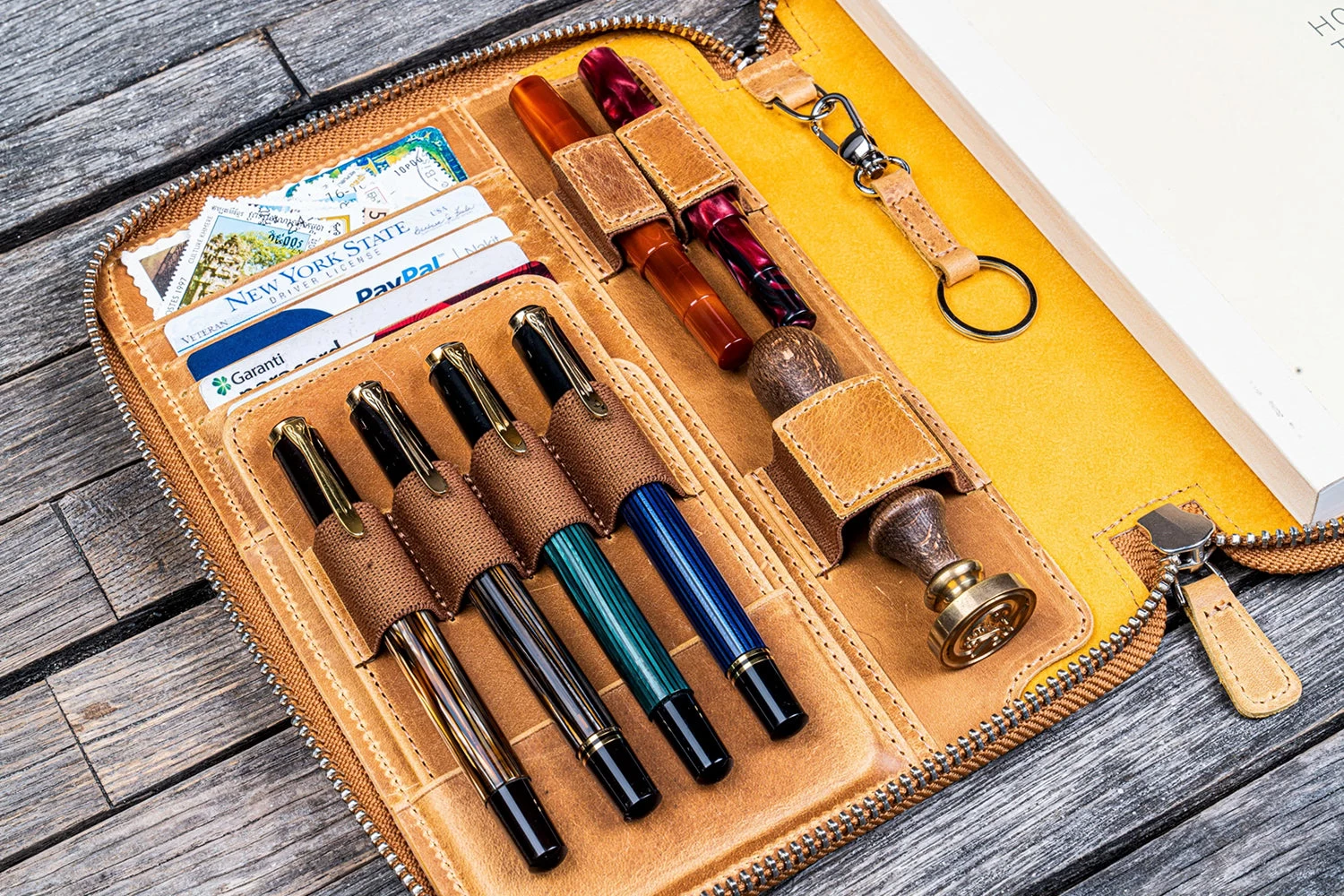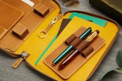 Save yourself the hassle of digging around your bag by keeping your valuables safe and secure in one place. This Galen Leather A5 zippered notebook folio is the perfect way to store your everyday essentials for work, study, or personal use. It has 4 credit card holders and a long pocket that keep your passport or your mobile phone. Under the left side, there is a sleeve for storing your iPad device. On the right, you can store a hard or soft cover A5 notebook. There are slots to support a sidebound or topbound notebook.