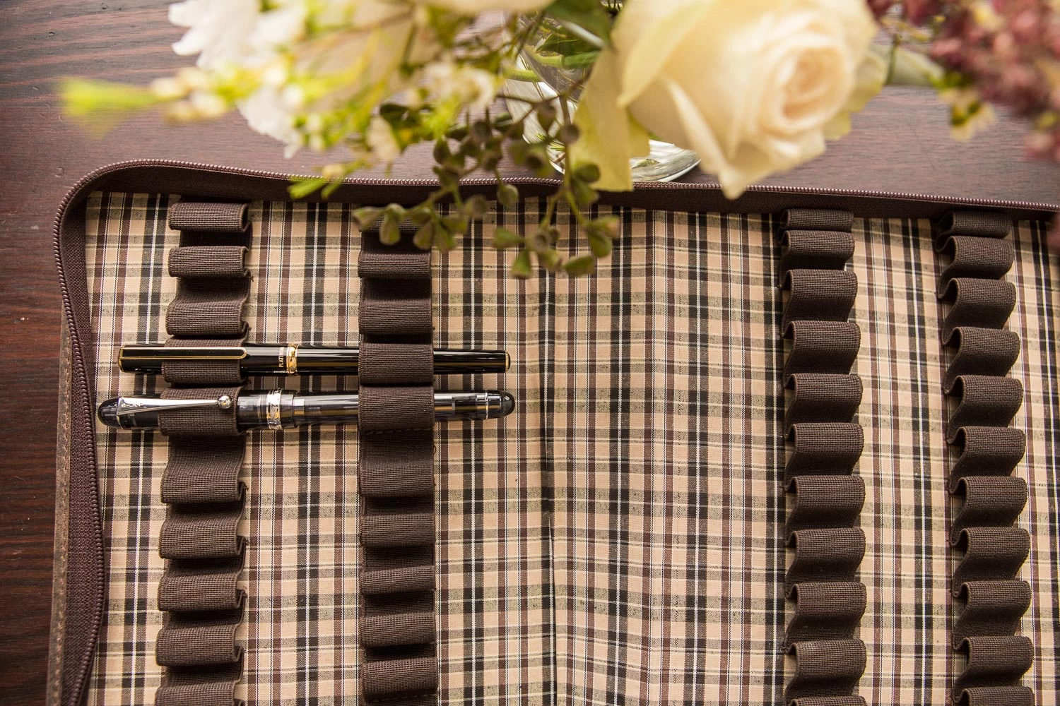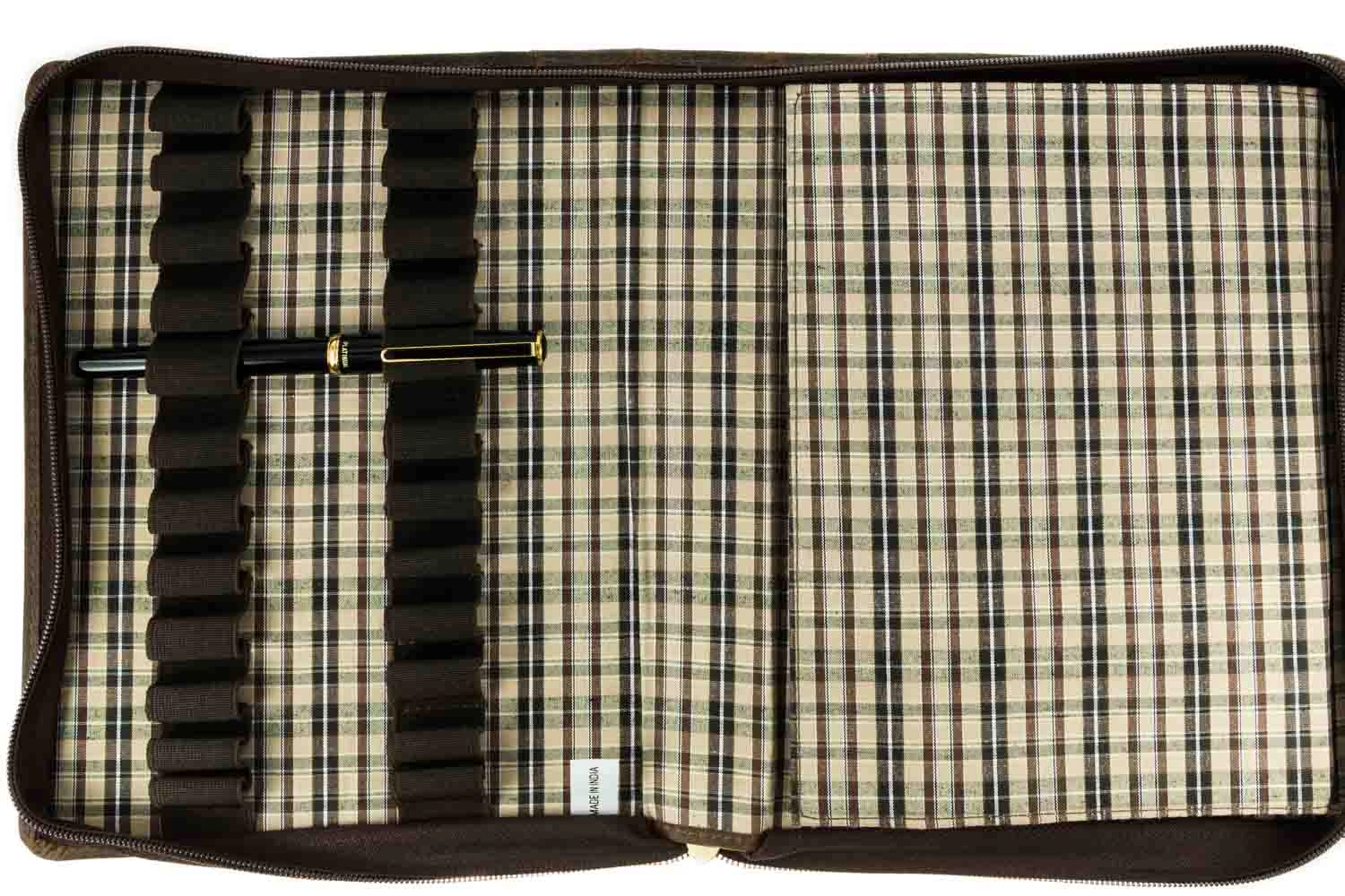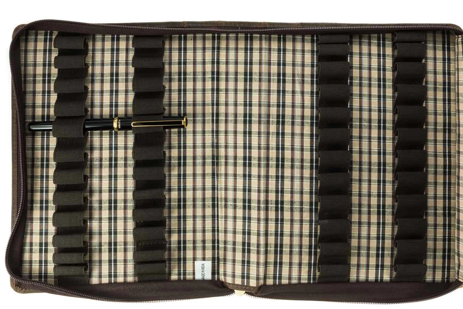 This brown leather Girologio zippered pen case has a plaid fabric interior and holds up to 24 pens. Made from high quality, ecologically tanned leather, Girologio pen cases are an excellent choice for protecting your writing instruments. These leather cases are soft and supple while simultaneously being tough and durable.