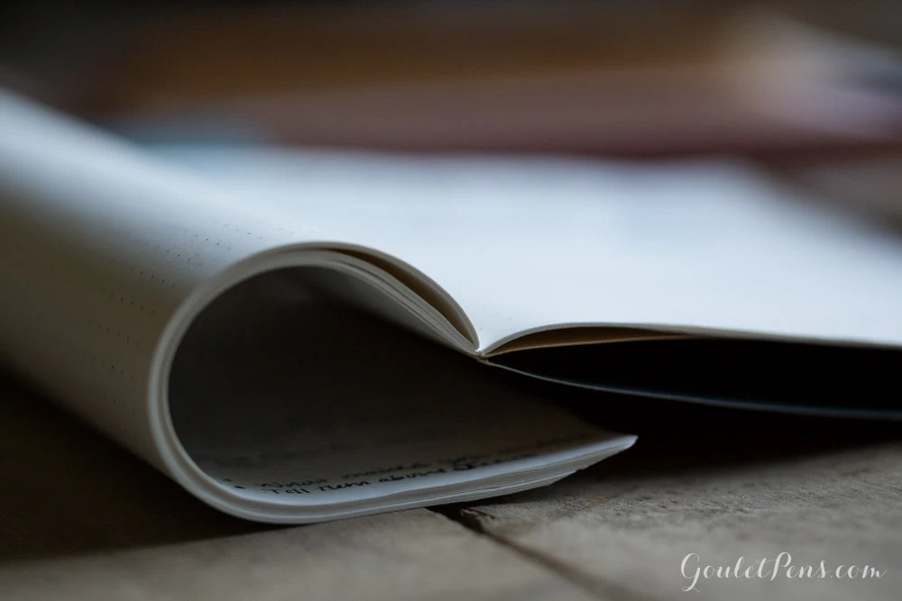 A Goulet Pens exclusive! This side stapled notebook features 48 sheets (96 pages) of white 52gsm fountain pen friendly dot grid Tomoe River paper, a blue-grey 150g kraft paper cover printed with soy ink, rounded corners, and measures 14.8cm x 21cm (approximately 5.83in x 8.27in, or standard A5 size). Made for us and assembled in Taiwan, using Tomoe River paper from Japan. Great for bullet journaling!