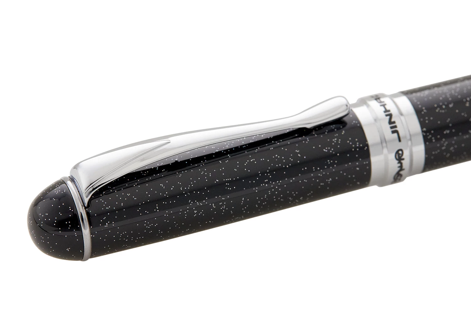 The Jinhao X750 fountain pen is made in China. It features a black body with tons of multi-colored sparkles throughout, chrome hardware, and a silver #6 steel nib. It comes with a converter, and also accepts standard international cartridges (not included).