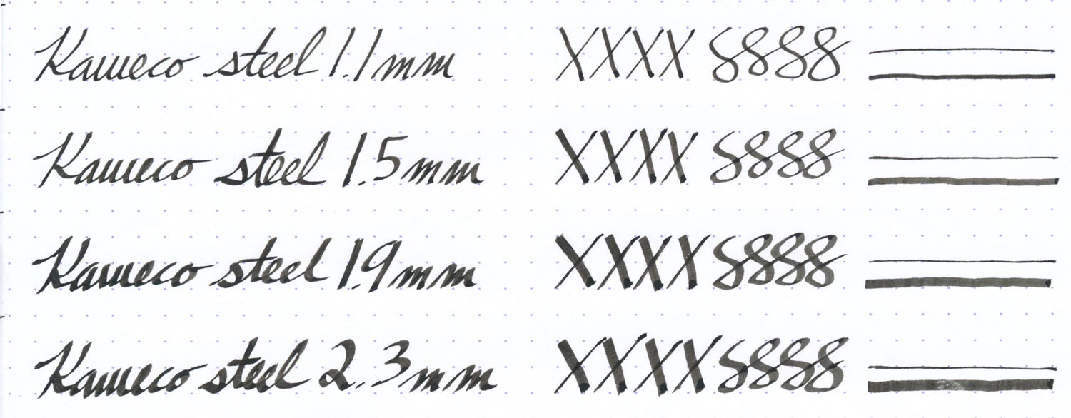 This Kaweco Perkeo calligraphy gift set comes with one full sized pen, two additional interchangeable front nib/grip sections, and several ink cartridges. The three silver stainless steel nibs are in sizes 1.1mm stub, 1.5mm stub, and 1.9mm stub.