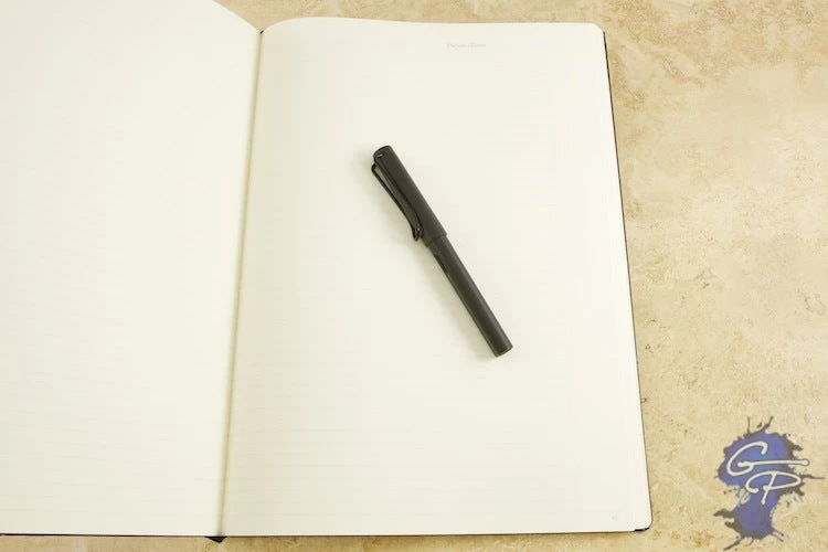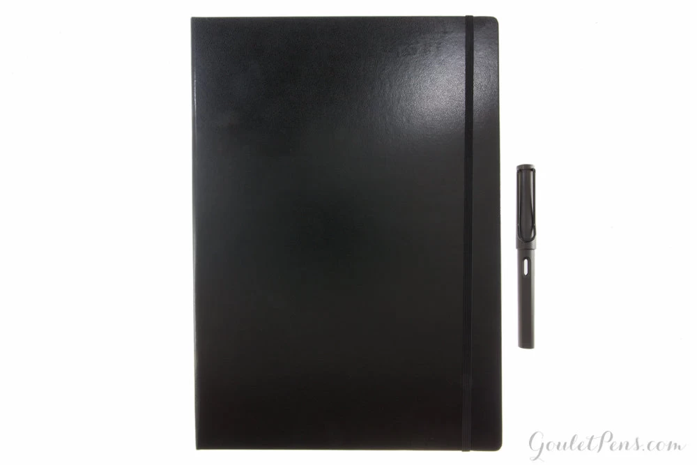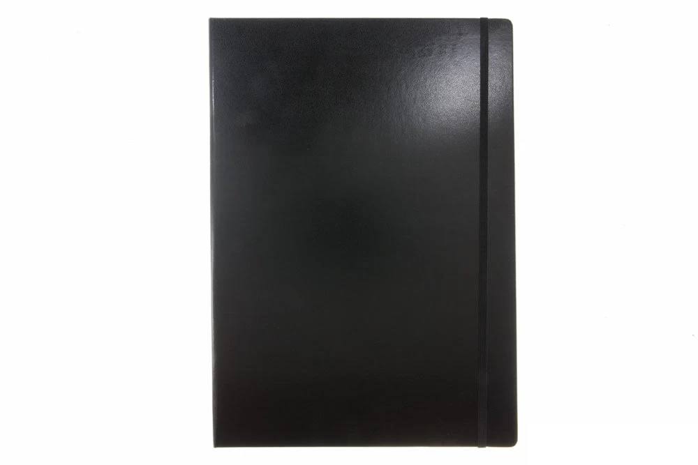 Apart from numerous details, the Master notebook stands out due to its size. In its A4 oversize format, it is large enough to accommodate loose sheets or photocopies between its pages or in its cover pocket without risk of damage. This black Master notebook is a classic with 233 numbered pages (117 sheets) and strong non-bleed ruled 100g paper. Lines are spaced 8mm apart. Features include an expandable pocket, a blank table of contents, two ribbon page markers, elastic band fastener, stickers for labeling/archiving, and it opens flat.