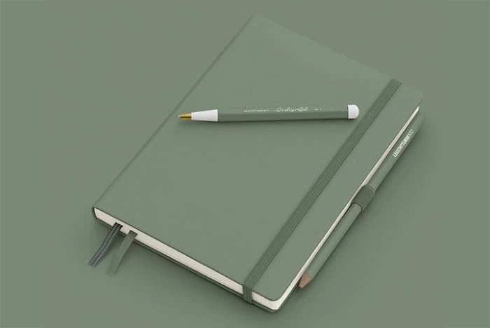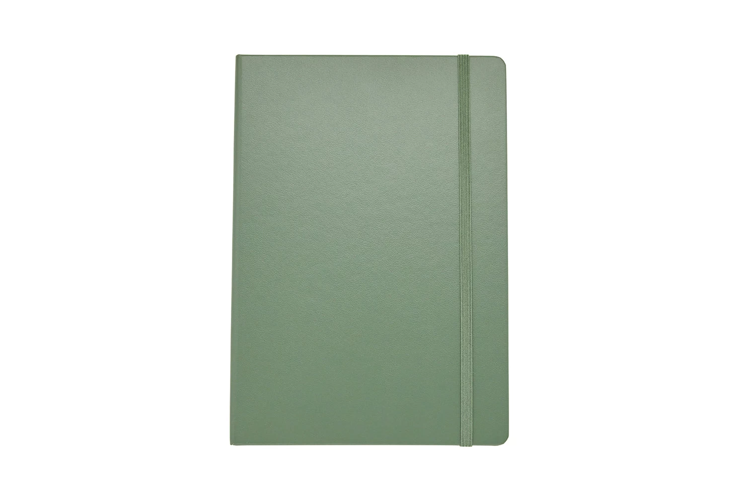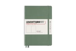 This medium A5-sized olive green Leuchtturm1917 hardcover notebook is equally suited for the desk and for use on the move. It contains 249 numbered pages (125 sheets) of 5mm dot grid 80g ivory paper. Features include an expandable pocket, a blank table of contents, two ribbon page markers, elastic band fastener, stickers for labeling/archiving, and it opens flat.