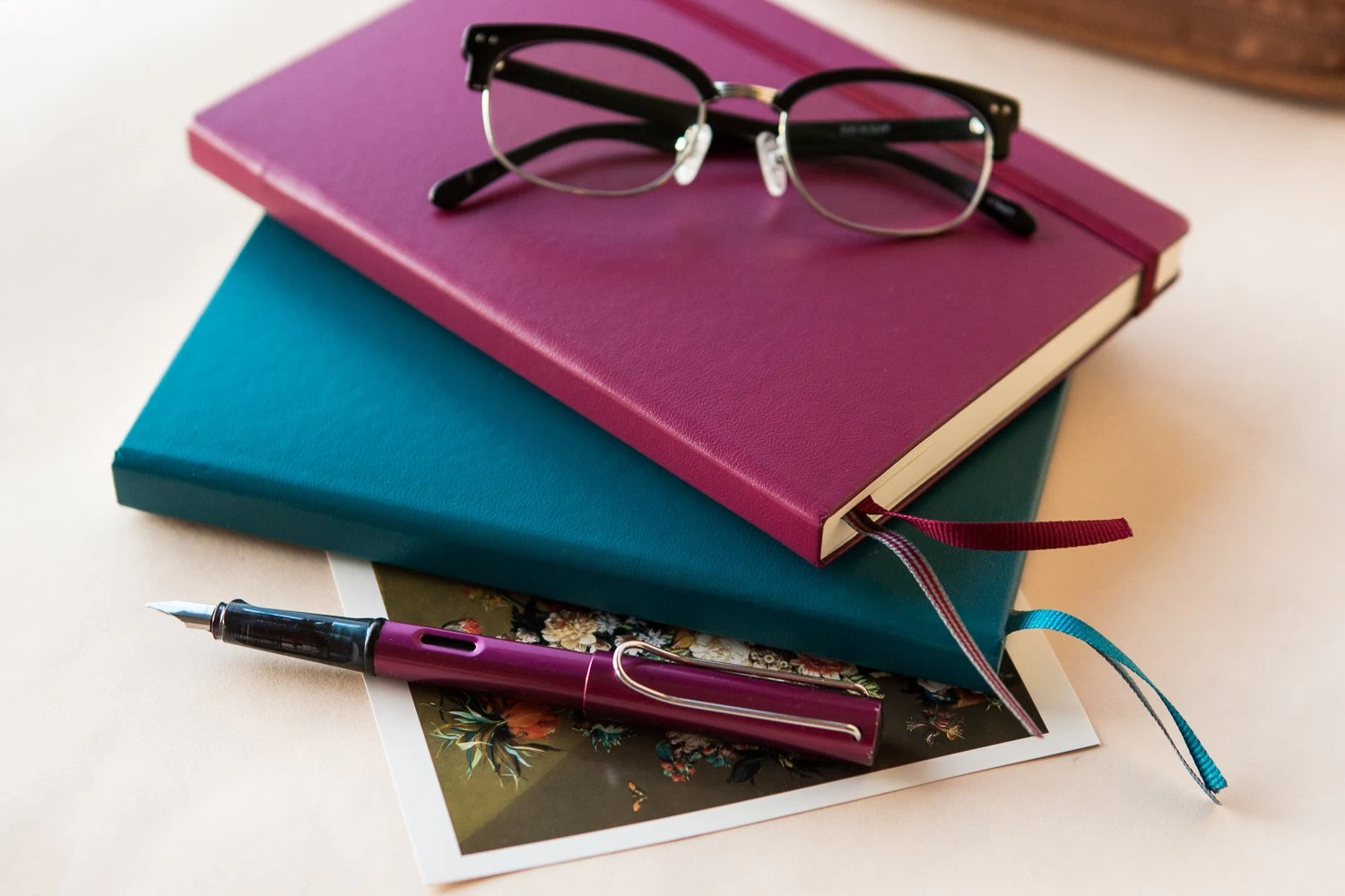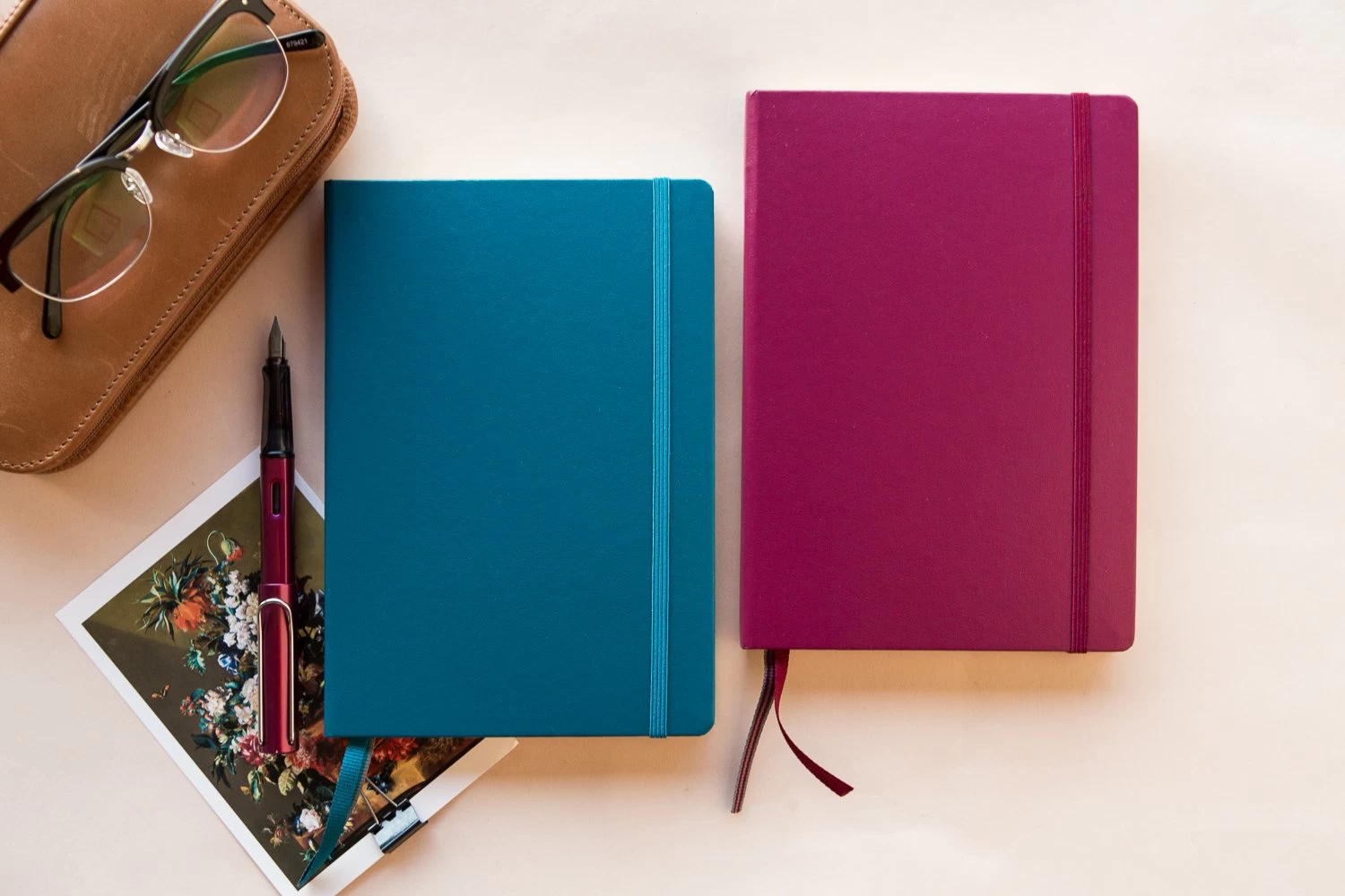 This medium A5-sized teal green Leuchtturm1917 hardcover notebook is equally suited for the desk and for use on the move. It contains 249 numbered pages (125 sheets) of lined 80g ivory paper. Lines are spaced 6mm apart. Features include an expandable pocket, a blank table of contents, two ribbon page markers, elastic band fastener, stickers for labeling/archiving, and it opens flat.