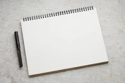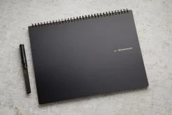 Made in Japan, this horizontal A4-sized notebook features 70 sheets of white acid-free 80gsm blank paper. The black double wire top spiral binding matches the black plastic cover. The notebook features blank paper to allow you the freedom to capture all of your creative writing and sketches, and every page is micro-perforated. Each sheet contains a blank margin at the top with a space for the title and date.