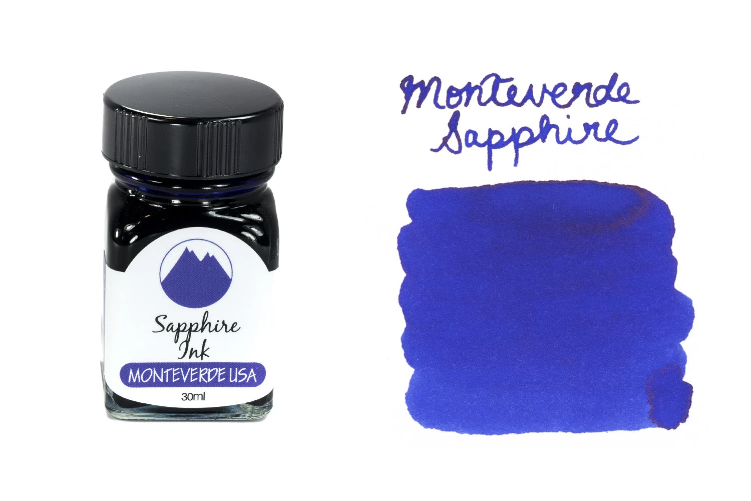 30ml glass bottle of Monteverde Sapphire blue fountain pen ink. This color is part of the Monteverde Gemstone collection.