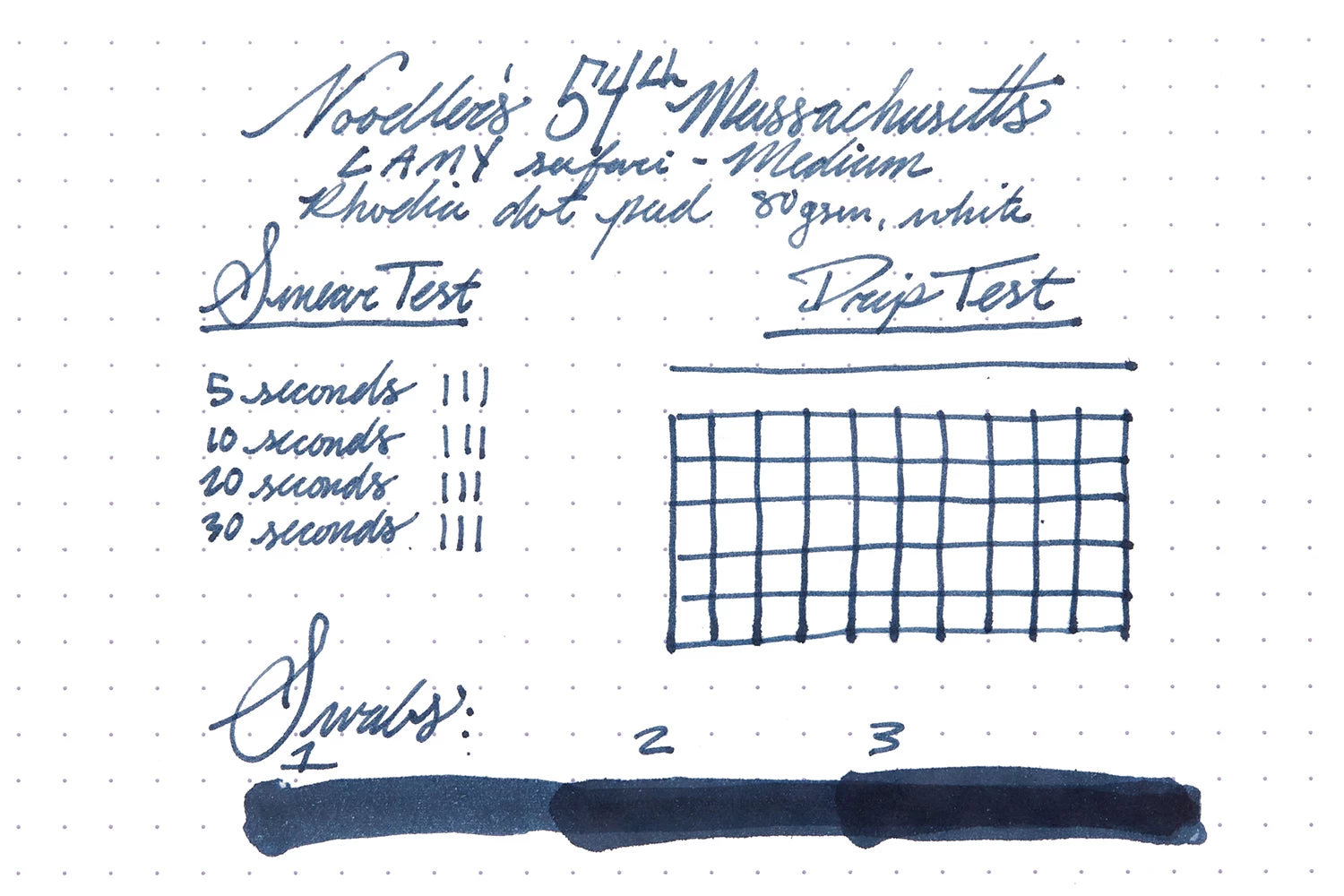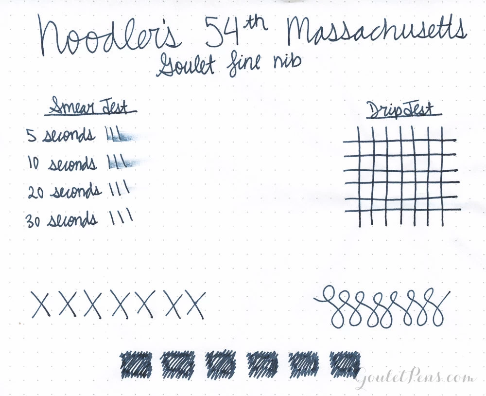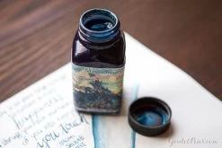 3oz (90ml) glass bottle of Noodler’s 54th Massachusetts fountain pen ink. 54th Massachusetts is a bulletproof, legal blue-black. Noodler’s inks are handcrafted, so there may be slight color variations from batch to batch.