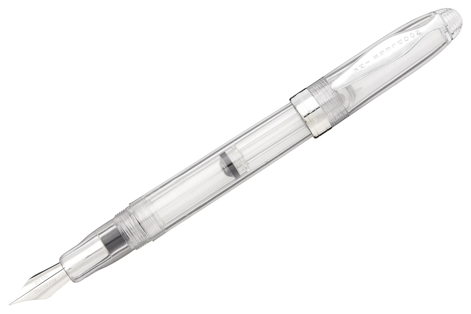 The Noodler’s Ahab flex pen features a steel flexible #6 nib and a slide piston mechanism. If you’d like, you can even remove the piston mechanism and use the pen as an eyedropper for a massive 6ml ink capacity. This clear demonstrator Ahab is made of a celluloid derivative and is technically biodegradable and formed from a “renewable resource”. The vegetal resin body of this pen may show particles or striations within the material. This is most noticeable in demonstrators and bright colors.