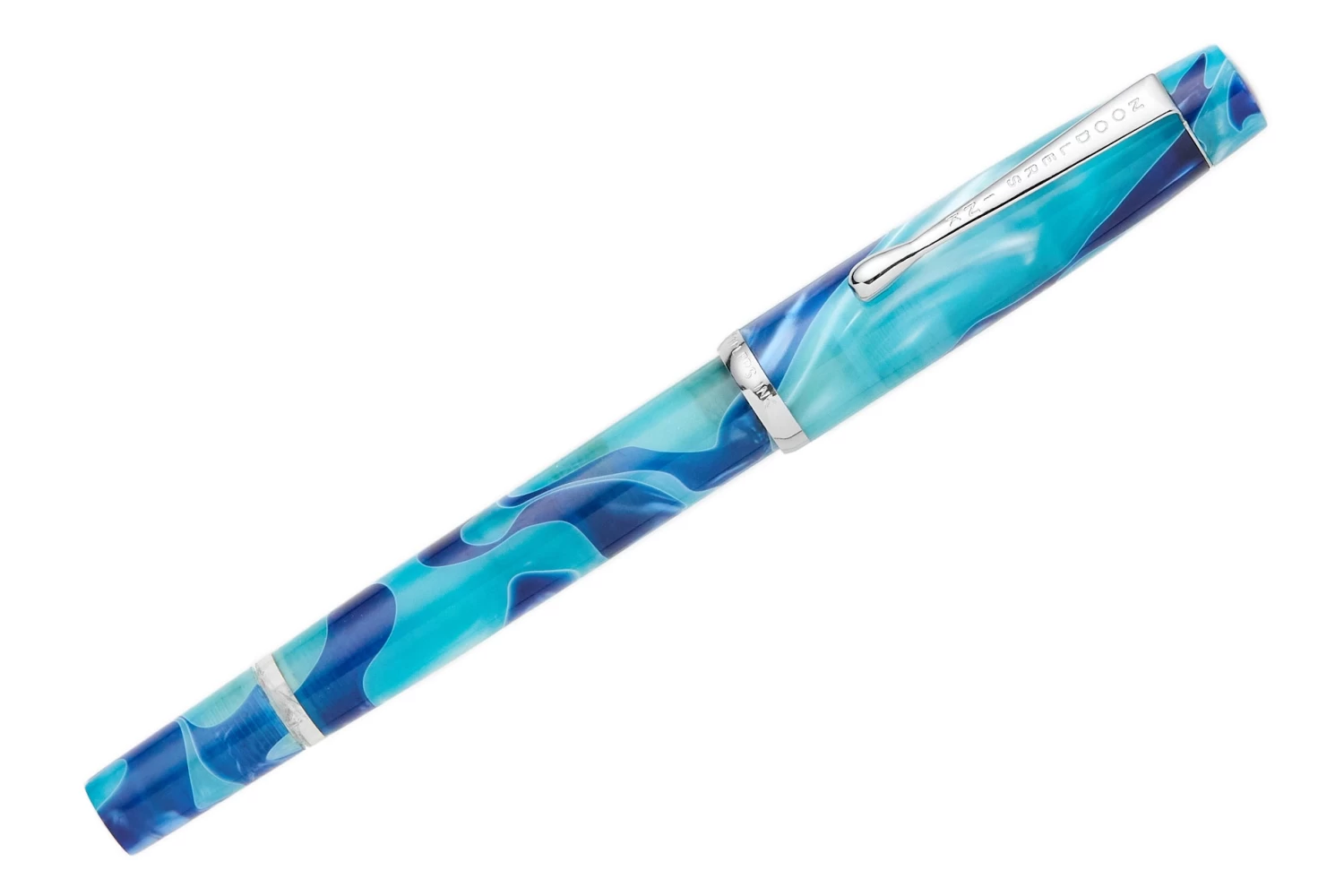 The Noodler’s Konrad flex pen is smaller than the Ahab, but larger than the Nib Creaper. This blue and turquoise acrylic resin fountain pen features a steel flexible nib and a twist piston mechanism with a blind cap. The Konrad Acrylic is made of acrylic acetate.