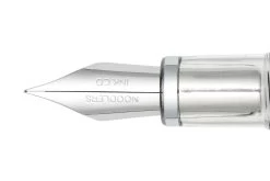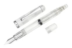 The Noodler’s Konrad flex pen is smaller than the Ahab, but larger than the Nib Creaper. This clear fountain pen features a steel flexible nib and a twist piston mechanism with a blind cap. The Konrad is made of a celluloid derivative and is technically biodegradable and formed from a “renewable resource”. The vegetal resin body of this pen may show particles or striations within the material. This is most noticeable in demonstrators and bright colors.