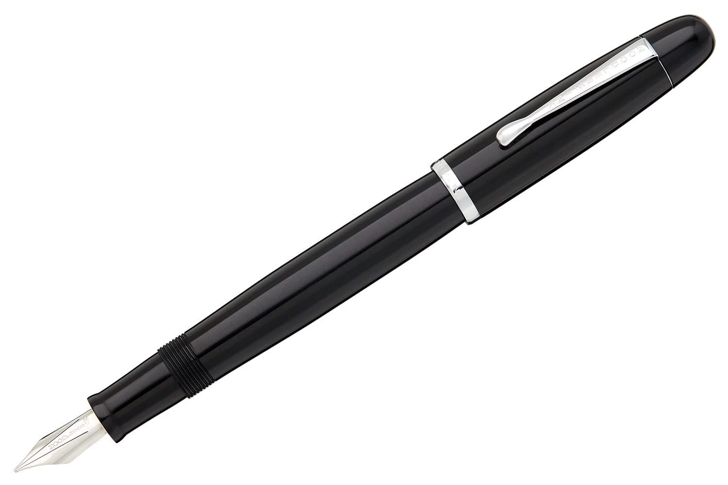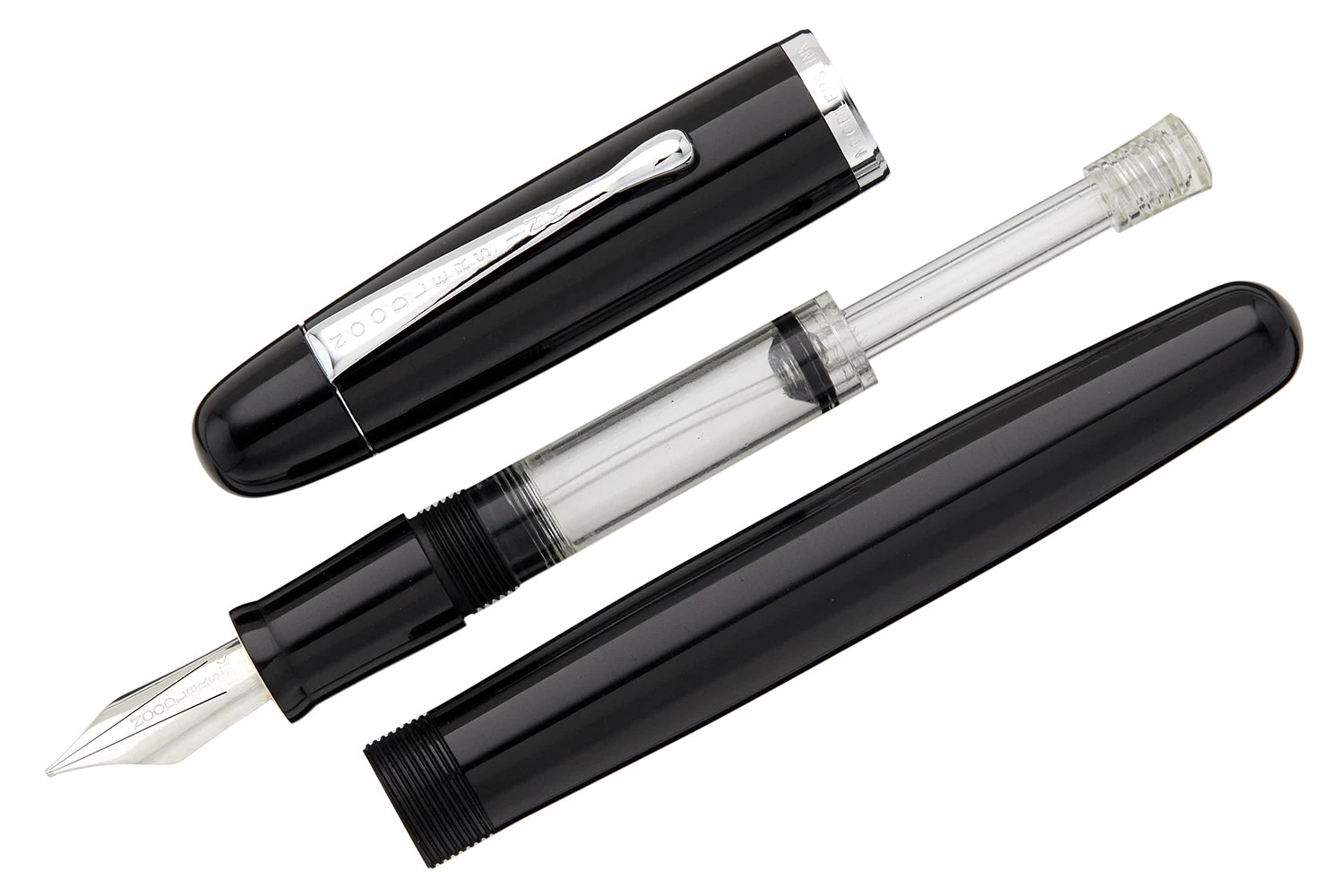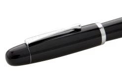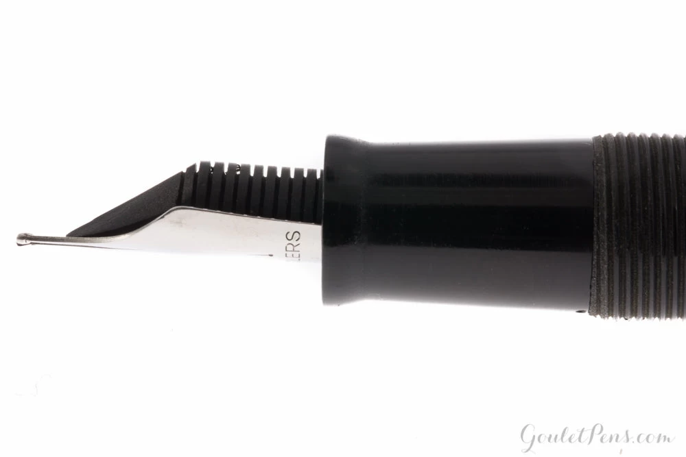 This black ebonite Noodler’s Neponset fountain pen is fitted with a flexible three-tined music nib, which has a velvet pen stroke with the ability to greatly vary the line width to the users liking. It has a built-in slide piston mechanism for use with bottled ink.