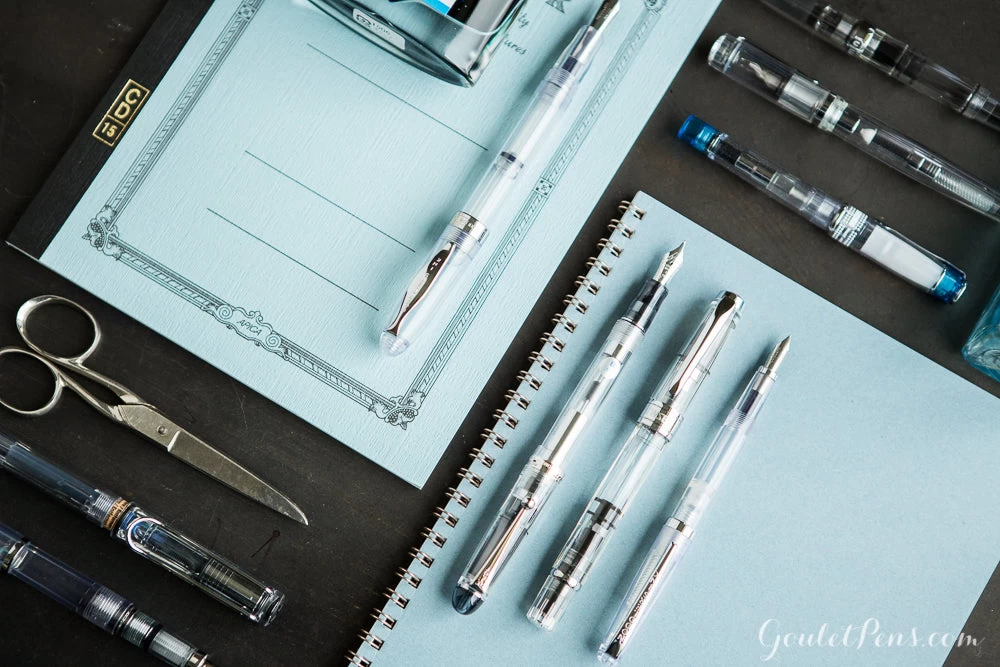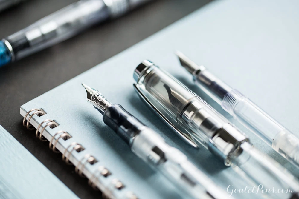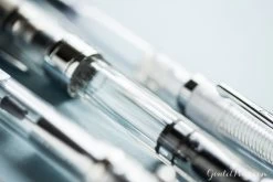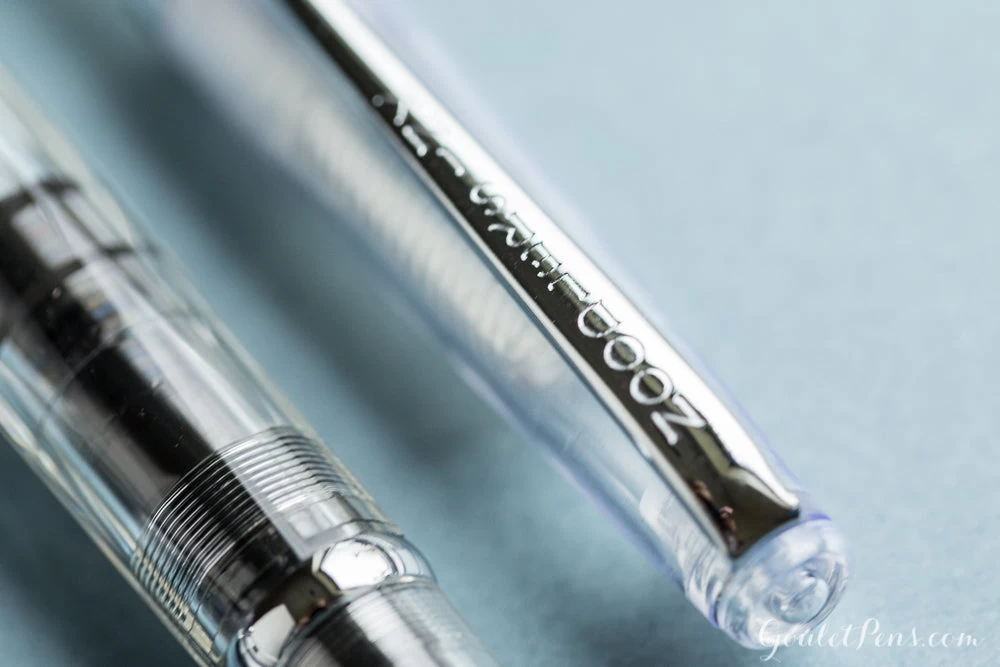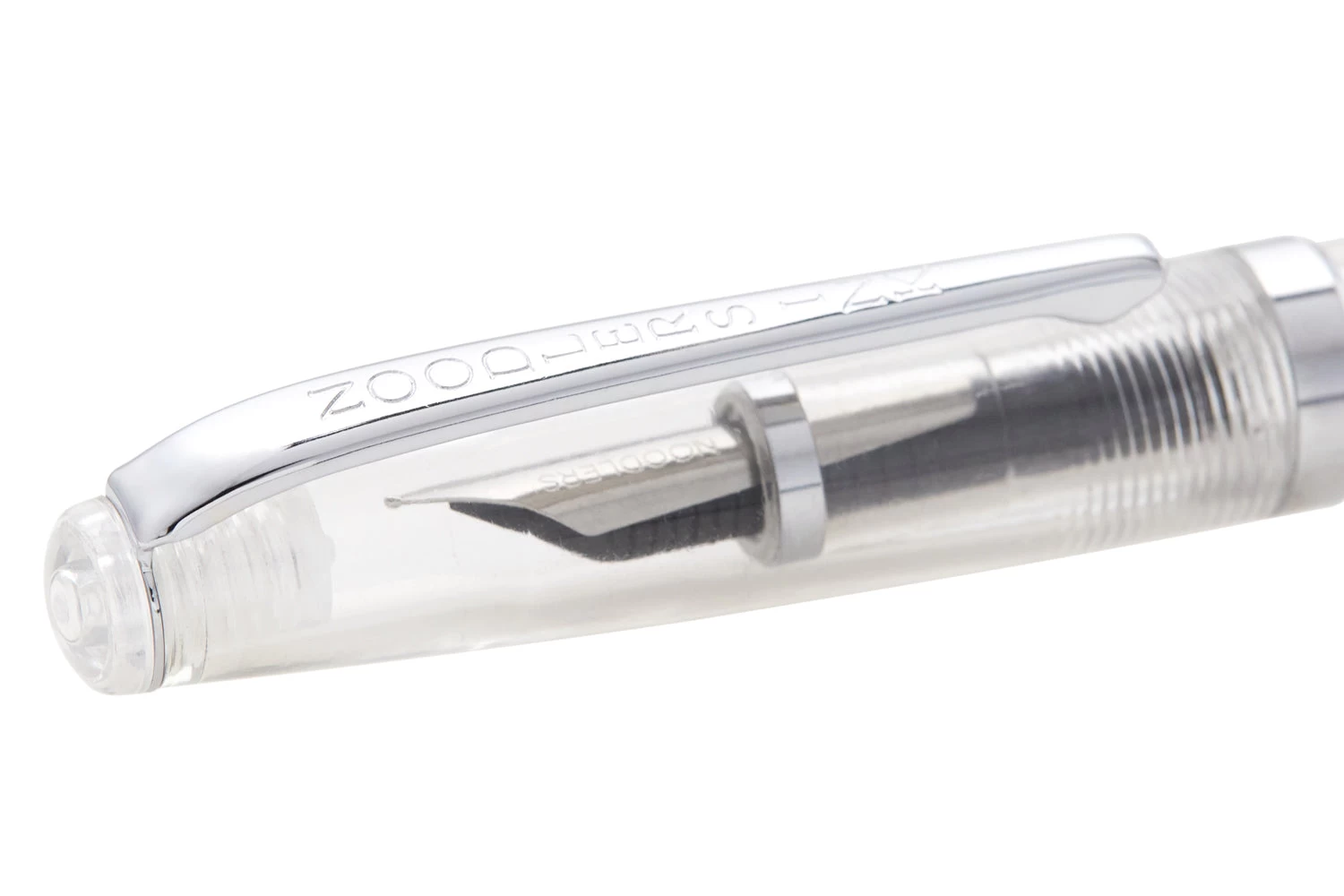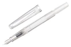 This clear Noodler’s Nib Creaper flex fountain pen features a small, slender body with a steel flexible #2 nib and a twist piston mechanism. A small ink window shows how much ink is left in your pen. These pens are made from a celluloid derivative. The vegetal resin body of this pen may show particles or striations within the material. This is most noticeable in demonstrators and bright colors.