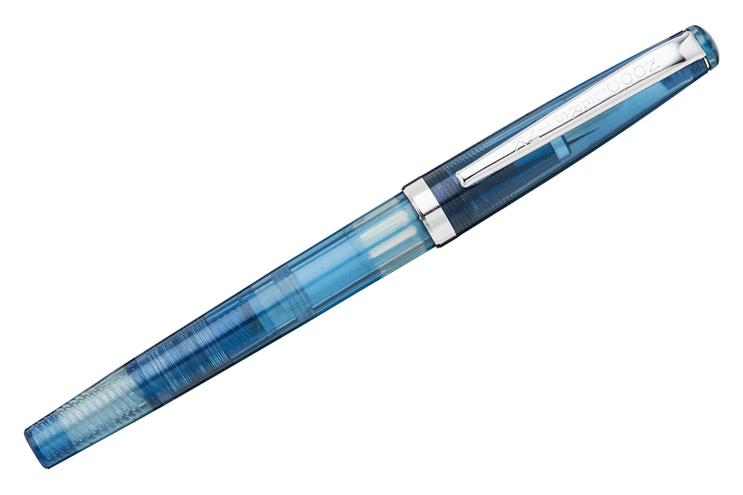 This translucent turquoise blue demonstrator Noodler’s Nib Creaper flex fountain pen features a small, slender body with a steel flexible #2 nib and a twist piston mechanism. A small ink window shows how much ink is left in your pen. These pens are made from a celluloid derivative. The vegetal resin body of this pen may show particles or striations within the material. This is most noticeable in demonstrators and bright colors.