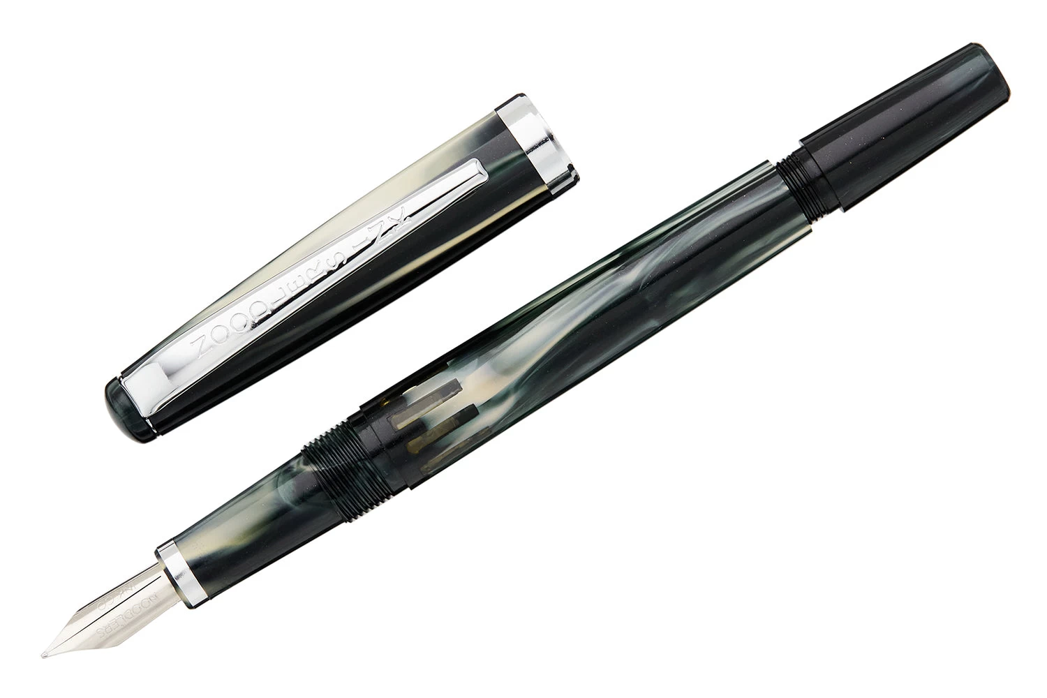 This white and black Noodler’s Nib Creaper flex fountain pen features a small, slender body with a steel flexible #2 nib and a twist piston mechanism. A small ink window shows how much ink is left in your pen. These pens are made from a celluloid derivative. The vegetal resin body of this pen may show particles or striations within the material. This is most noticeable in demonstrators and bright colors.