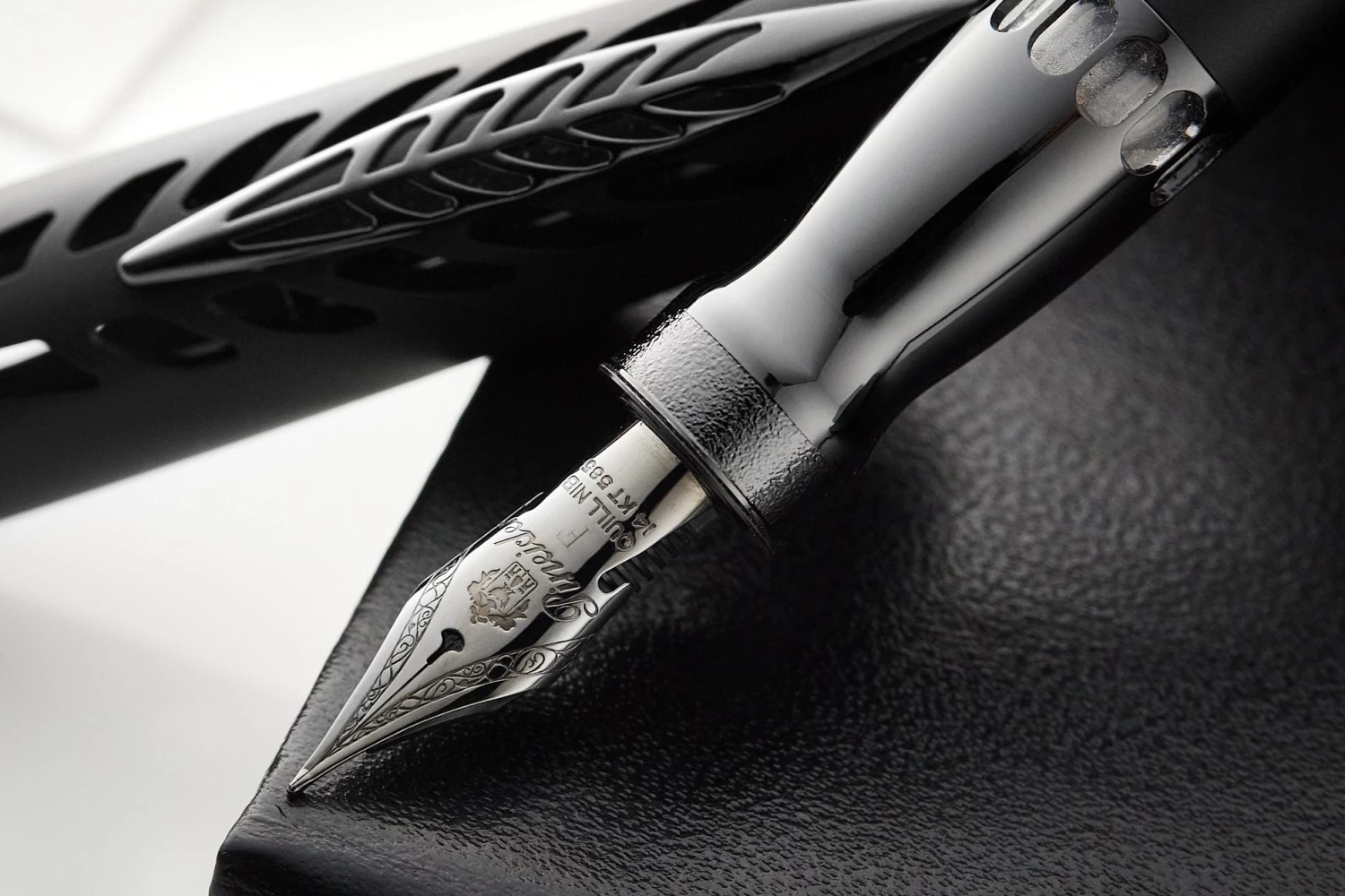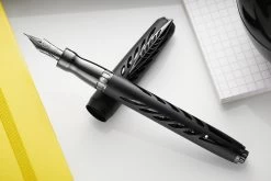 This matte black Aluminum fountain pen features multiple cuts with a black trim and black plated 14k gold nib.