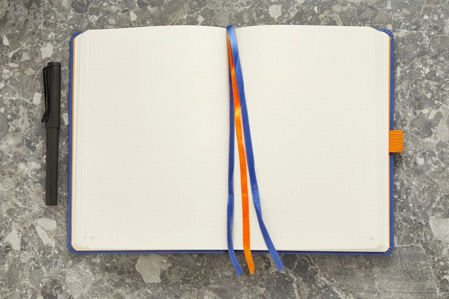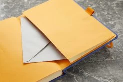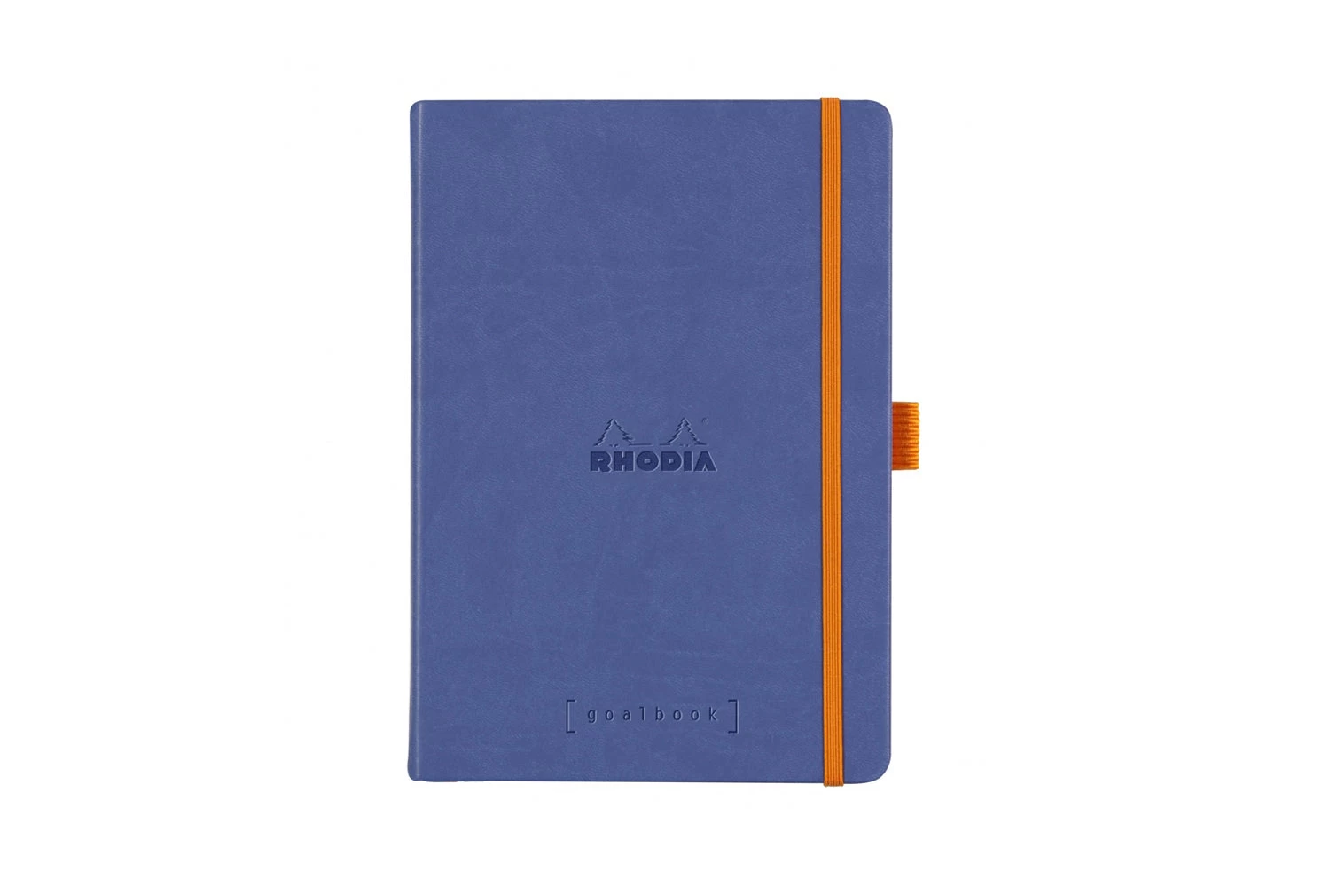 The Rhodia Goalbook’s features include a 6-page table of contents, an undated annual calendar, and undated monthly pages. Each notebook also features numbered pages, three ribbon bookmarks, an attached orange pen loop, an expanding back pocket, glued spine, and an orange elastic closure.