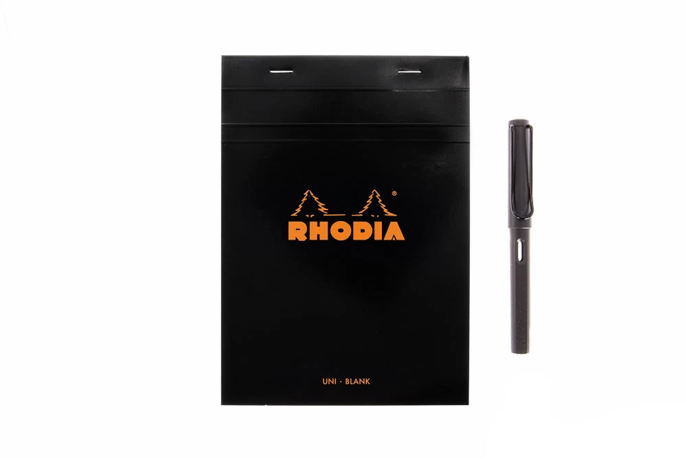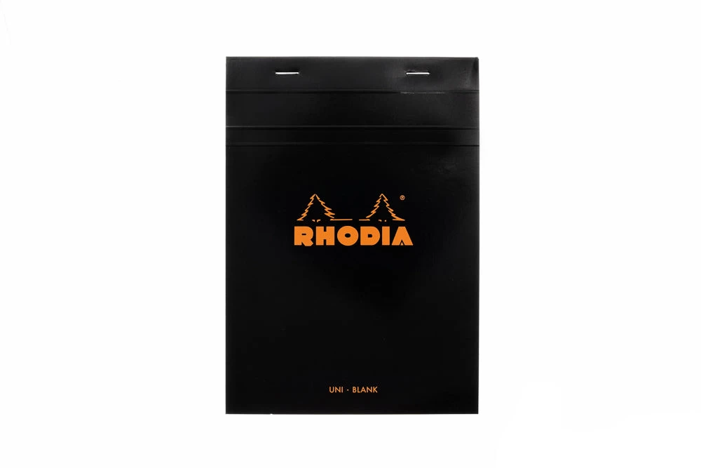 This A5-sized black Rhodia notepad features 80 sheets of extra white 80g acid-free, pH neutral blank paper. Each sheet is microperforated at the top for easy and clean removal. The top stapled cover folds back cleanly, and there is a hard cardboard back for writing support. These economical pads are a favorite of artists, designers, writers, and notebook fans for notes, sketching, and hand drafting. People love them for their grids, smooth paper, and iconic cover.