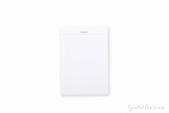 This A5-sized white Rhodia notepad features 80 sheets of extra white 80g acid-free, pH neutral ruled paper.Lines are spaced 7mm apart, and there is a subtle vertical margin line on the left. Each sheet is microperforated at the top for easy and clean removal. The top stapled cover folds back cleanly, and there is a hard cardboard back for writing support. These economical pads are a favorite of artists, designers, writers, and notebook fans for notes, sketching, and hand drafting. People love them for their smooth paper and iconic cover.