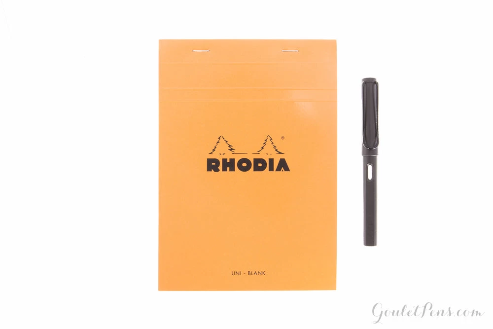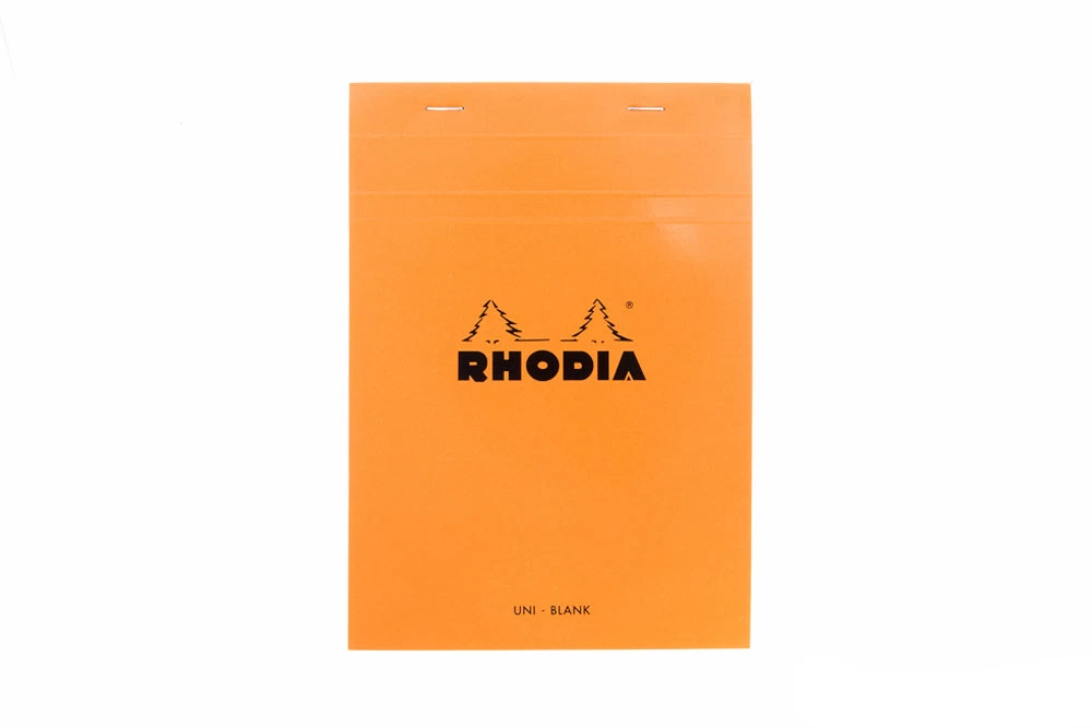 This A5-sized orange Rhodia notepad features 80 sheets of extra white 80g acid-free, pH neutral blank paper. Each sheet is microperforated at the top for easy and clean removal. The top stapled cover folds back cleanly, and there is a hard cardboard back for writing support. These economical pads are a favorite of artists, designers, writers, and notebook fans for notes, sketching, and hand drafting. People love them for their grids, smooth paper, and iconic cover.