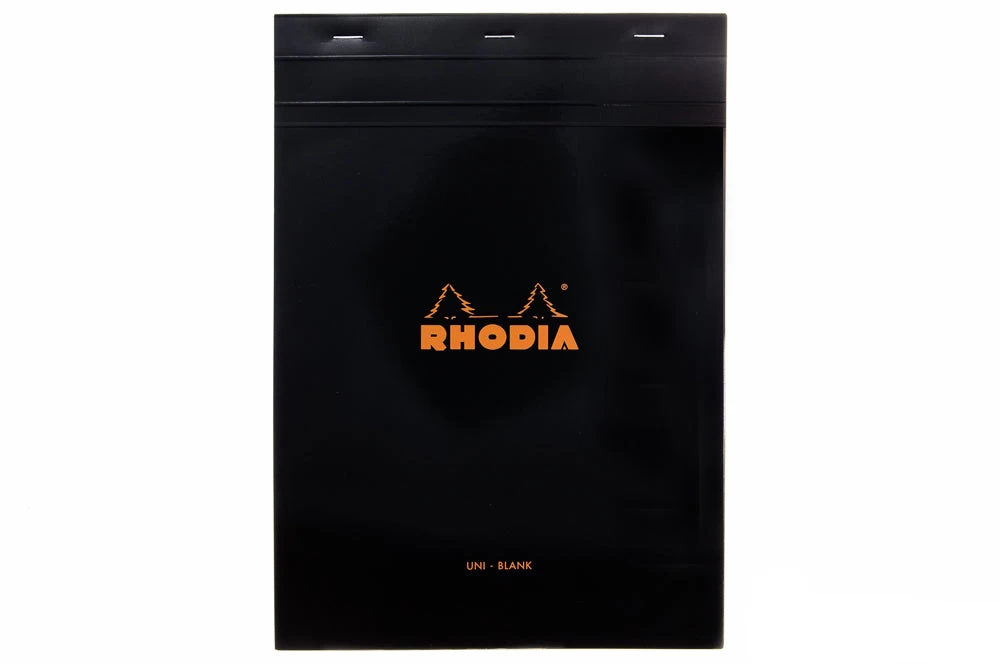 This A4-sized black Rhodia notepad features 80 sheets of extra white 80g acid-free, pH neutral blank paper. Each sheet is microperforated at the top for easy and clean removal. The top stapled cover folds back cleanly, and there is a hard cardboard back for writing support. These economical pads are a favorite of artists, designers, writers, and notebook fans for notes, sketching, and hand drafting. People love them for their grids, smooth paper, and iconic cover.