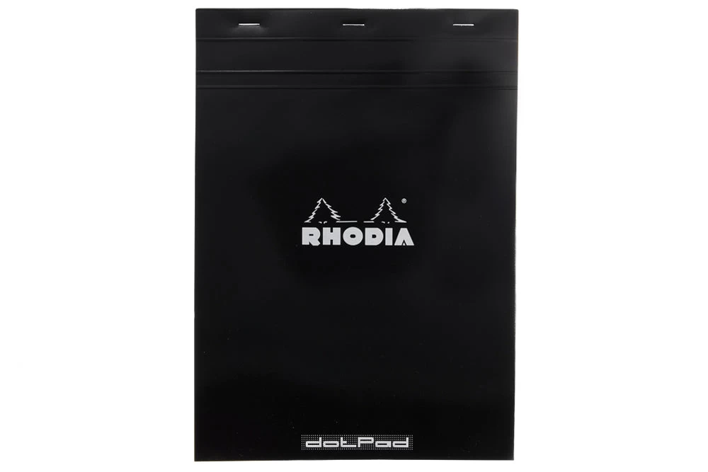 This A4-sized black Rhodia notepad features 80 sheets of extra white 80g acid-free, pH neutral 5mm dot grid paper. Each sheet is microperforated at the top for easy and clean removal. The top stapled cover folds back cleanly, and there is a hard cardboard back for writing support. These economical pads are a favorite of artists, designers, writers, and notebook fans for notes, sketching, and hand drafting. People love them for their grids, smooth paper, and iconic cover.