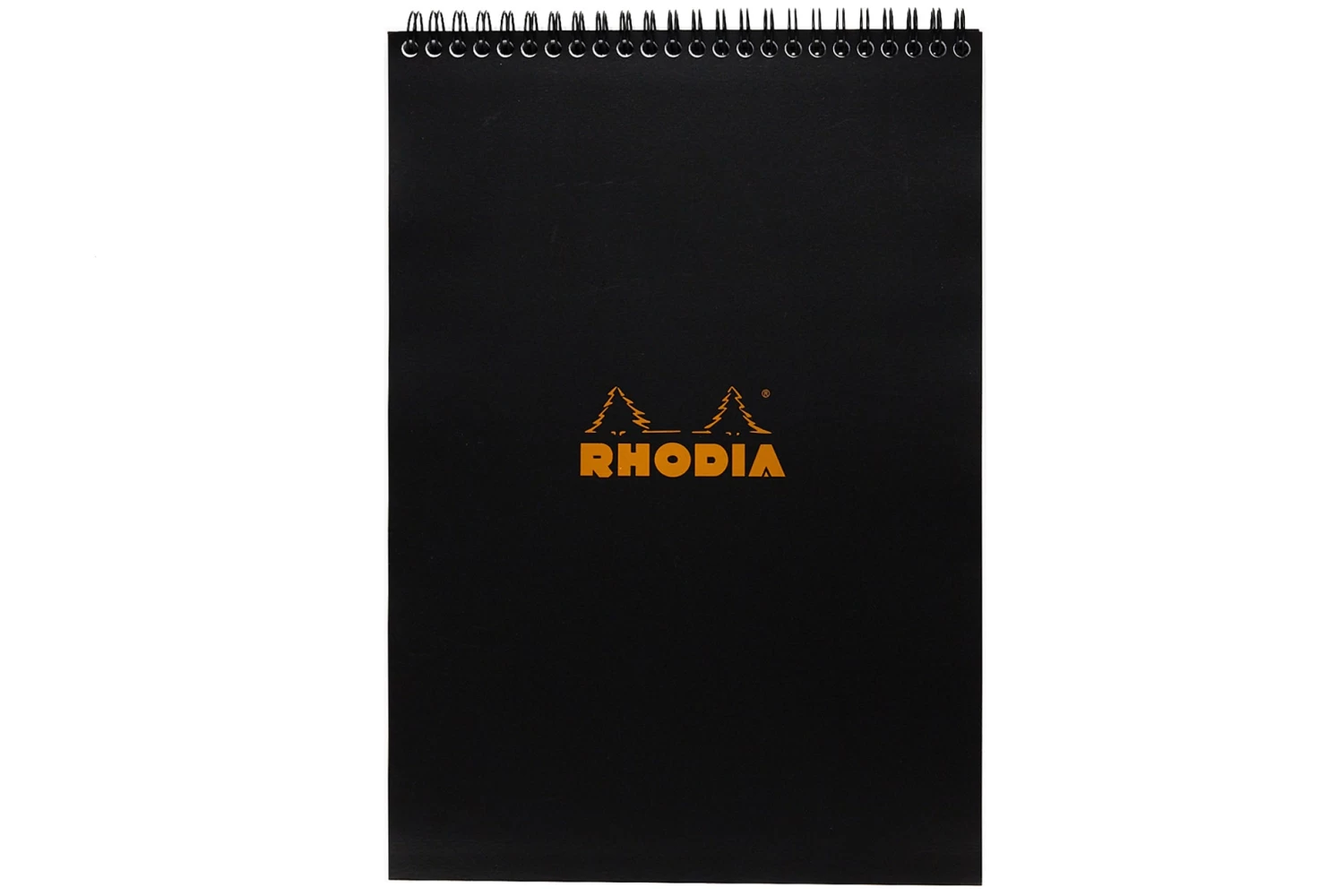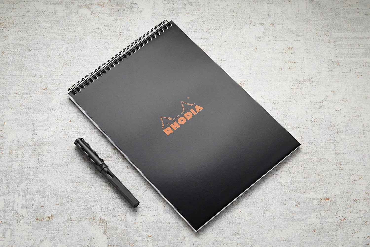This A4-sized black Rhodia top wirebound notepad features 80 sheets of extra white 80g acid-free, pH neutral 5mm graph paper. Each sheet is microperforated at the top for easy and clean removal. There is a hard cardboard back for writing support. These economical pads are a favorite of artists, designers, writers, and notebook fans for notes, sketching, and hand drafting. People love them for their grids, smooth paper, and iconic cover.