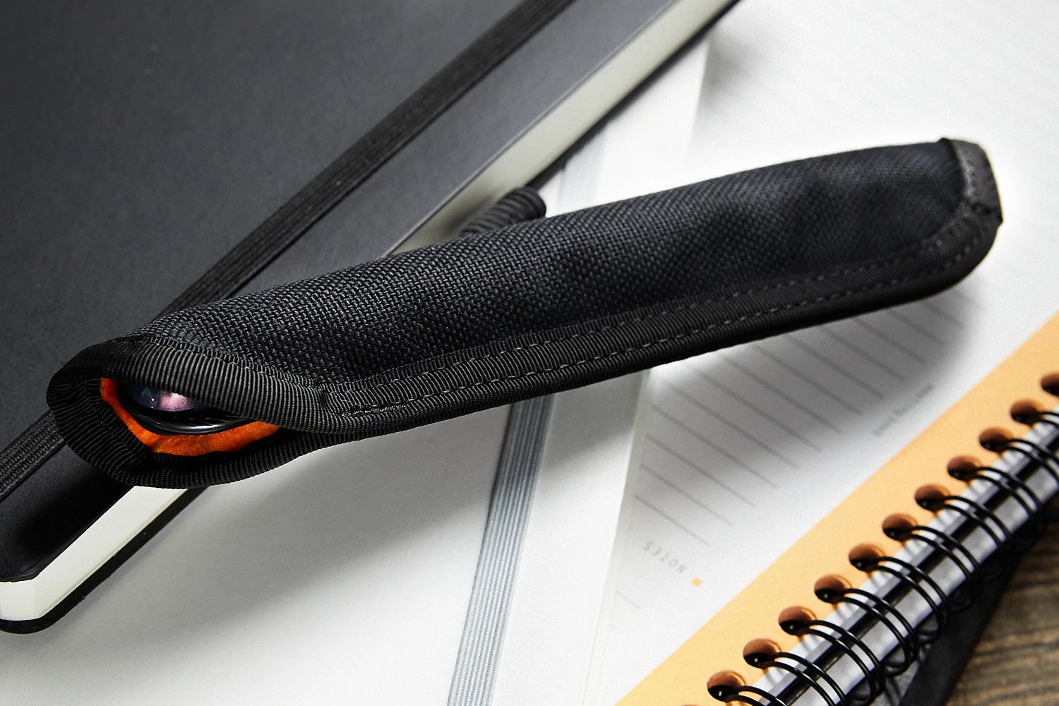 Protect your precious pens from the daily rough-and-tumble with these plush-lined sleeves. This Rickshaw Bagworks single pen sleeve features a solid black polyester canvas material, with a super-soft orange plush interior.
