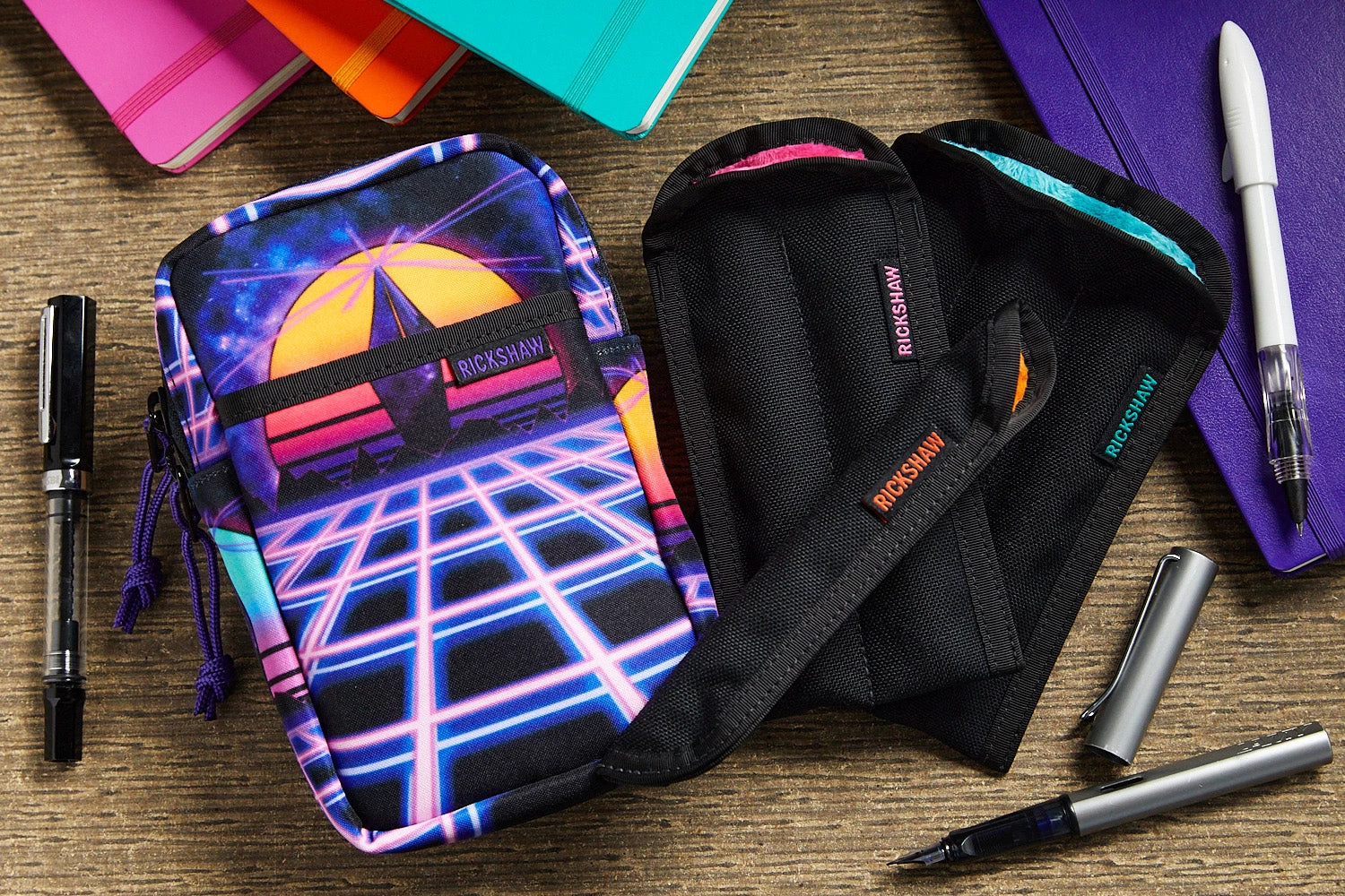Rickshaw Bagworks pen sleeves are made in San Francisco. The exterior is Rickshaw’s DigiPrint™ polyester canvas, and the interior is Royal Plush™ polyester. Black nylon binding and thread. All materials are colorfast and machine washable.