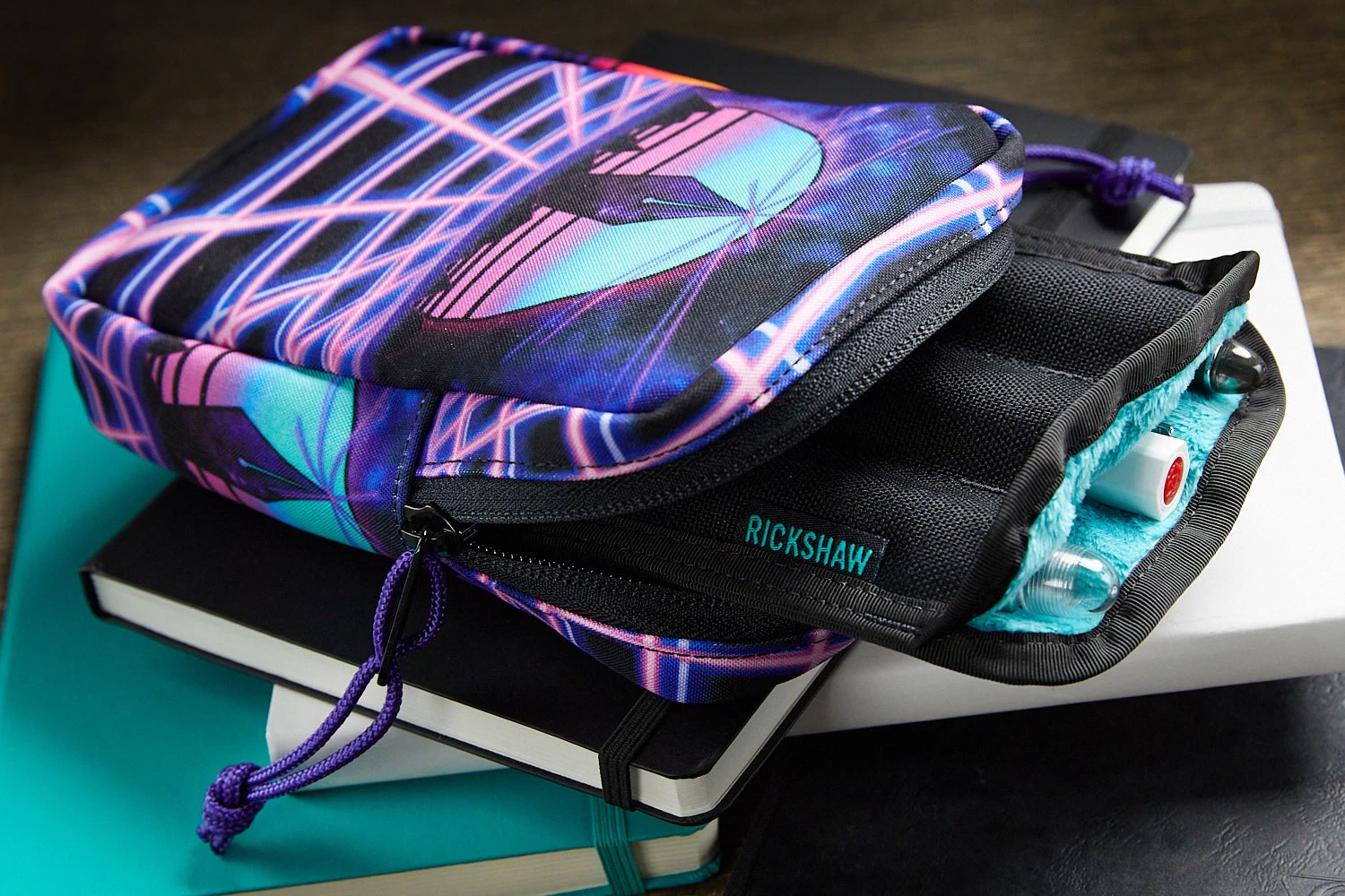 Rickshaw Bagworks pen sleeves are made in San Francisco. The exterior is Rickshaw’s DigiPrint™ polyester canvas, and the interior is Royal Plush™ polyester. Black nylon binding and thread. All materials are colorfast and machine washable.