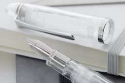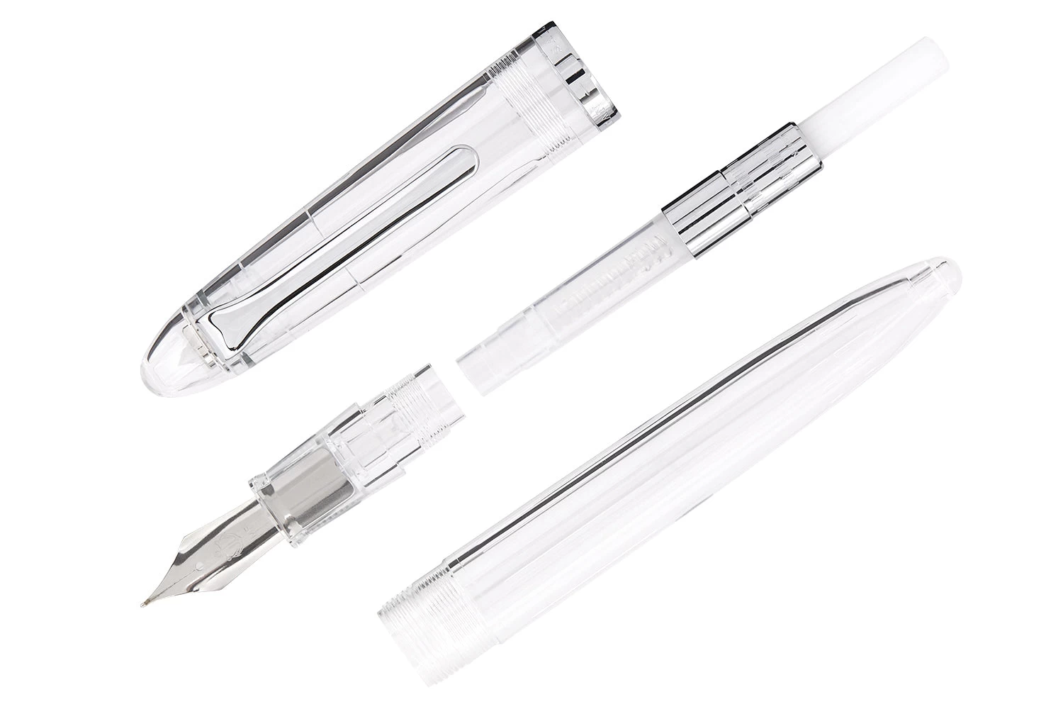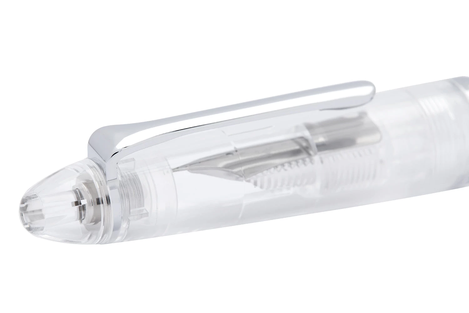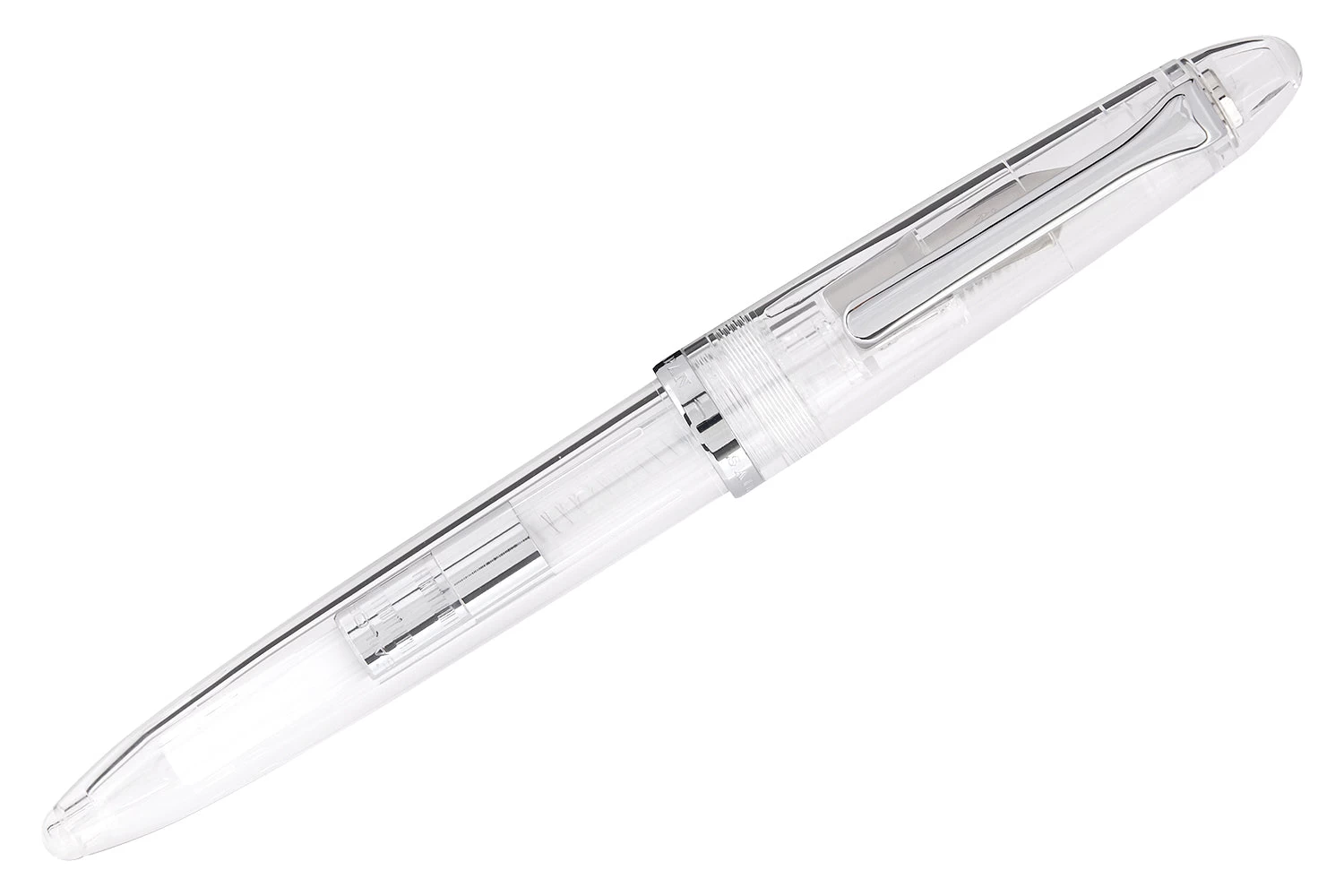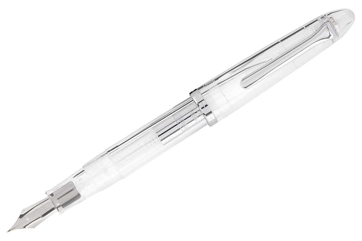 This Sailor Compass 1911 fountain pen has a transparent clear resin body, a clear feed, and silver trim. It comes with a stainless steel nib in Medium Fine. Each pen comes packaged in a gift box with a color-matched Sailor proprietary converter and two proprietary Sailor Black ink cartridges.