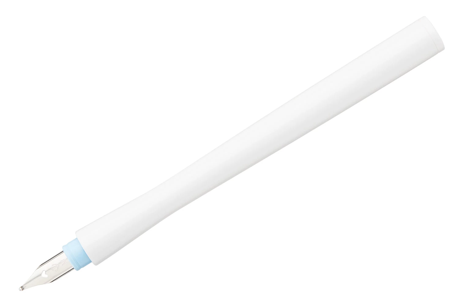 This pen comes with a white barrel and a Medium steel nib with a light blue accent. An attachable ink reservoir is available separately.