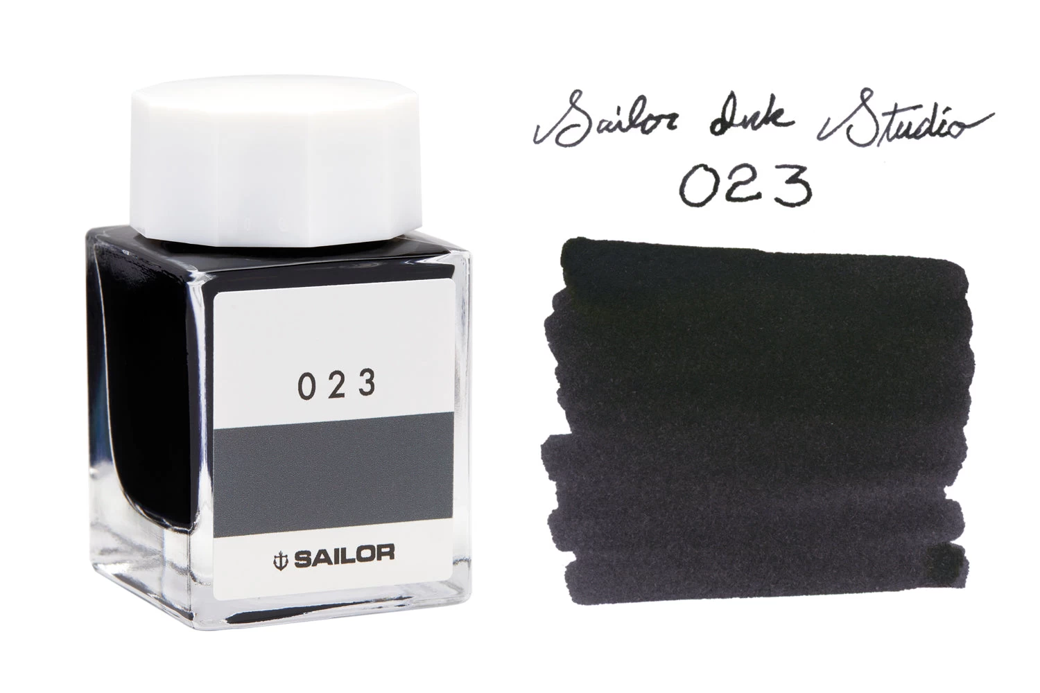 20ml square glass bottle of Sailor Ink Studio 023 fountain pen ink, a black color.