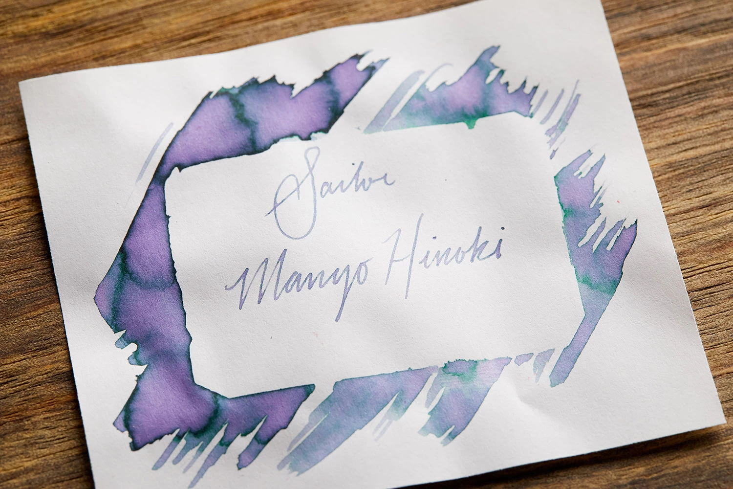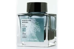 50ml square glass bottle of Sailor Manyo Hinoki dual shading fountain pen ink. This smooth-flowing water-based dye ink is specifically formulated to be safe for all fountain pens.
