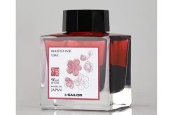 50ml square glass bottle of Sailor Manyo Ume red fountain pen ink. This smooth-flowing water-based dye ink is specifically formulated to be safe for all fountain pens.