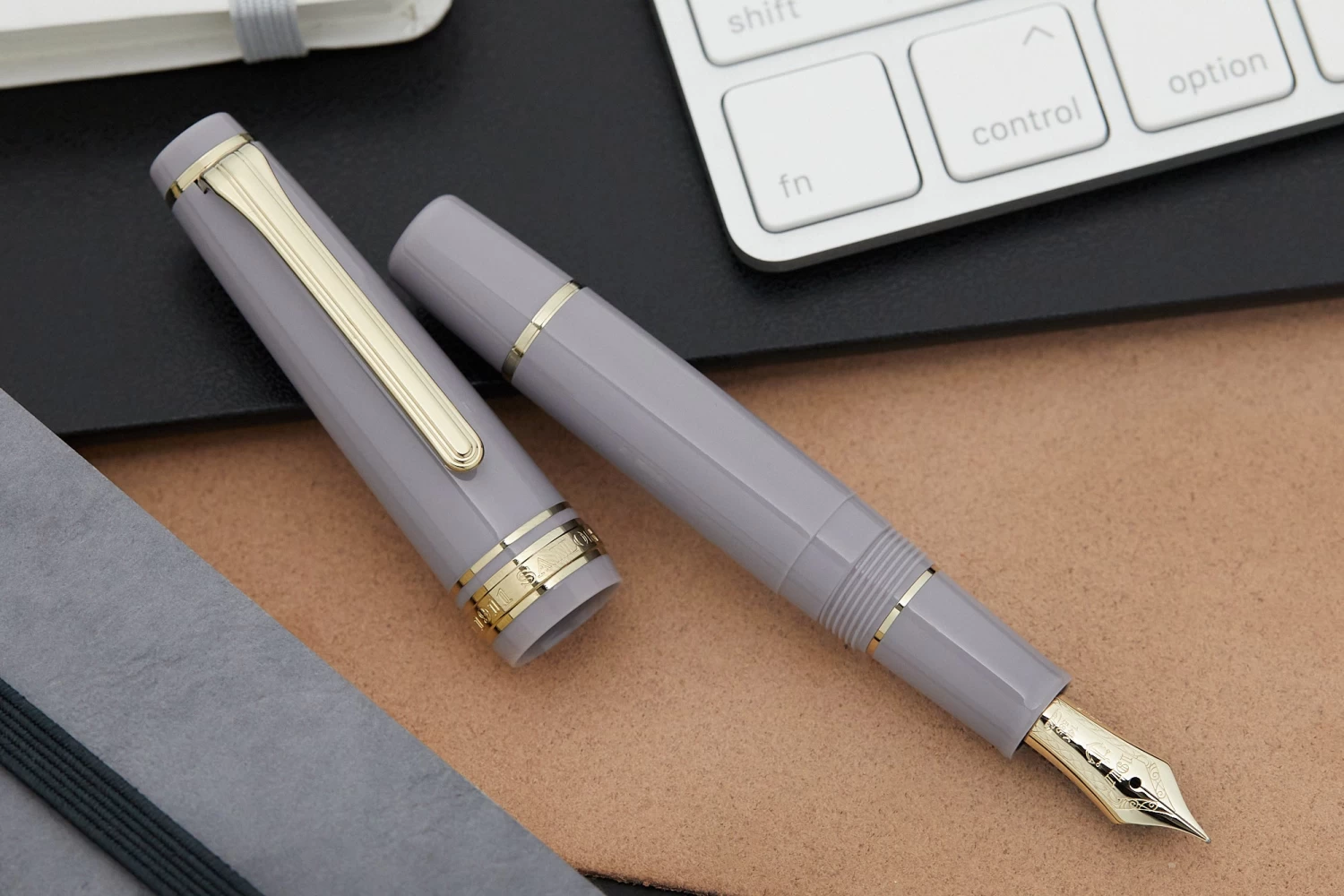 This Sailor Pro Gear Slim Mini fountain pen features a gray resin body and cap and is complemented by gold-plated accents. The flat top cap features the Sailor anchor logo inset into the top finial. This pocket-sized compact fountain pen comes equipped with Sailor’s legendary 14k yellow gold nib in medium fine. The cap screws open and close, and can be pushed to post securely onto the back of the barrel when writing.