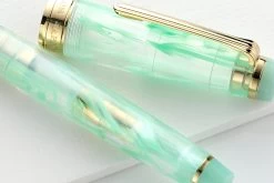 The Sailor Veilio Pearl Mint fountain pen shines with a refreshing mint hue on its finials, a dreamy swirling minty motif throughout its translucent body, and the elegance of IP gold details shimmering both within and externally. This remarkable pen features Sailor’s smaller 21K gold nib, which offers superior elasticity and feedback for an unmatched writing experience.