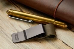 Attach this to the leather cover of the Traveler’s Notebook to hold a pen. It can hold pens of diameter up to 12mm. Metal clip, olive leather pen holder.