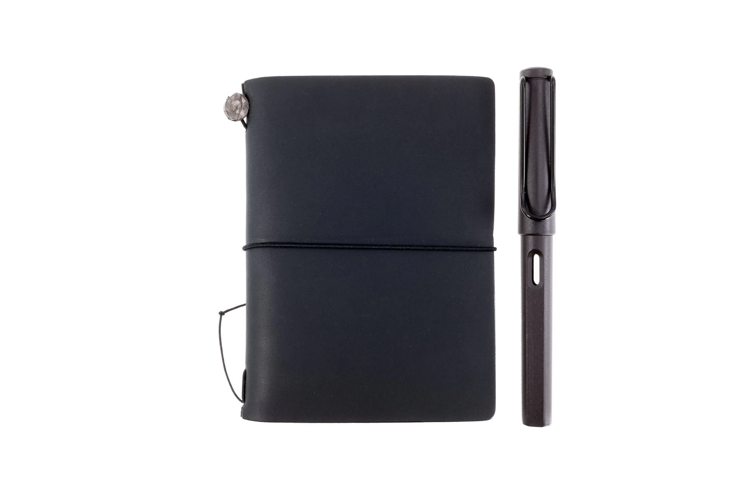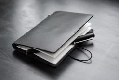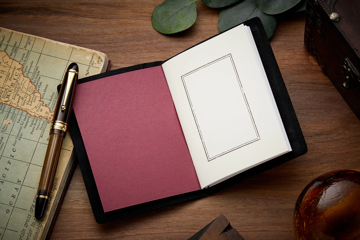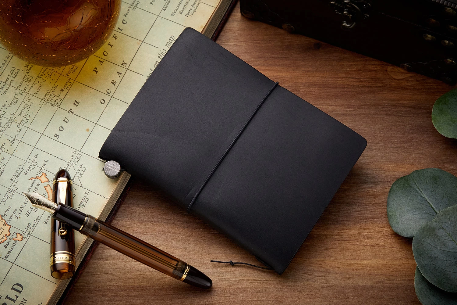 In a way, it is a passport into the journey of your life. Traveling abroad, you get a stamp on your passport. Moving forward in the journey of your life, you can write down your experiences in this passport-sized notebook. It comes in a package which contains the black leather cowhide cover, a blank notebook, a cotton case, and a spare closure rubber band (of a different color).