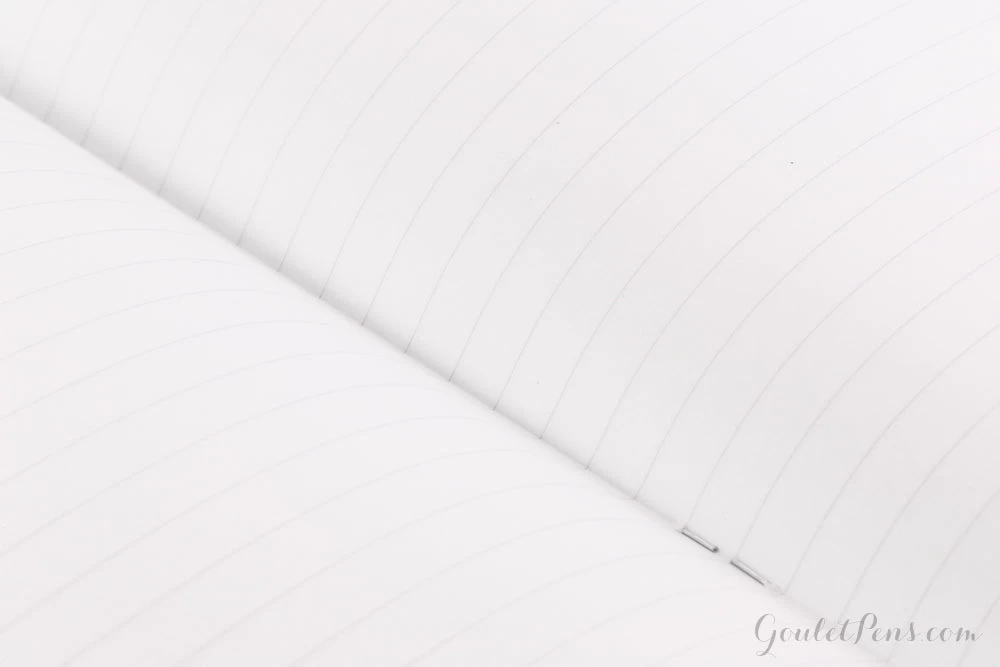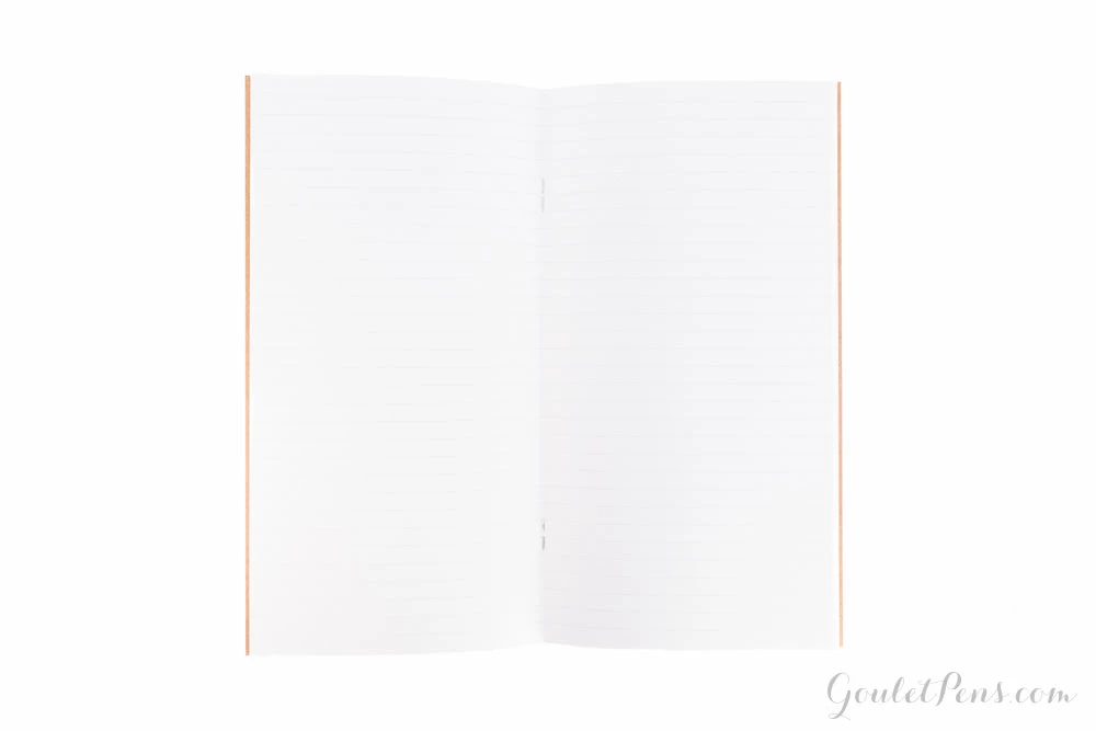 This refill for the regular size Traveler’s Notebook measures 11cm x 21cm (approximately 4.33in x 8.25in), and contains 32 sheets (64 pages) of white fountain pen friendly lined Midori MD paper. Lines are spaced 6.5mm apart.