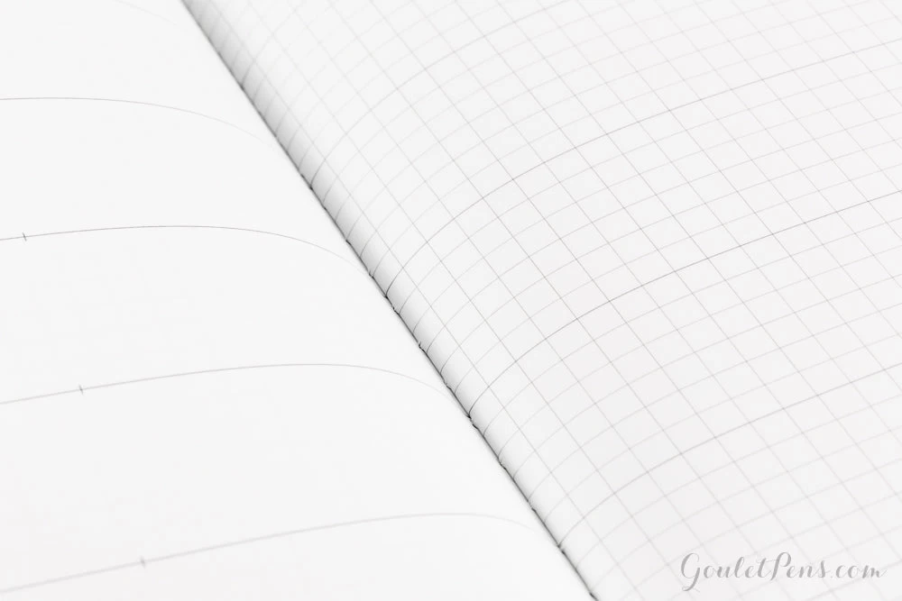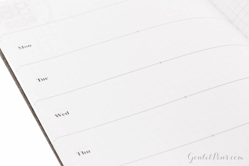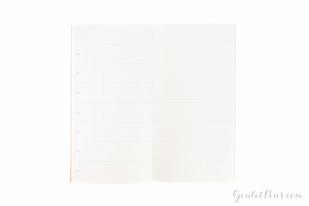 This refill for the regular size Traveler’s Notebook measures 11cm x 21cm (approximately 4.33in x 8.25in), and contains 32 sheets (64 pages) of ivory fountain pen friendly Midori MD paper. Binding is stitched. A diary in weekly format without dates on one side, grid paper on the other. You can begin using it in any month you want. A single bundle contains 6 months of weekly pages. Just customize and use it like you want to. Weekly pages (for 28 weeks, half a year), monthly pages: 64 pages in total. Since a bundle contains pages for half a year, you need two to cover a whole year.